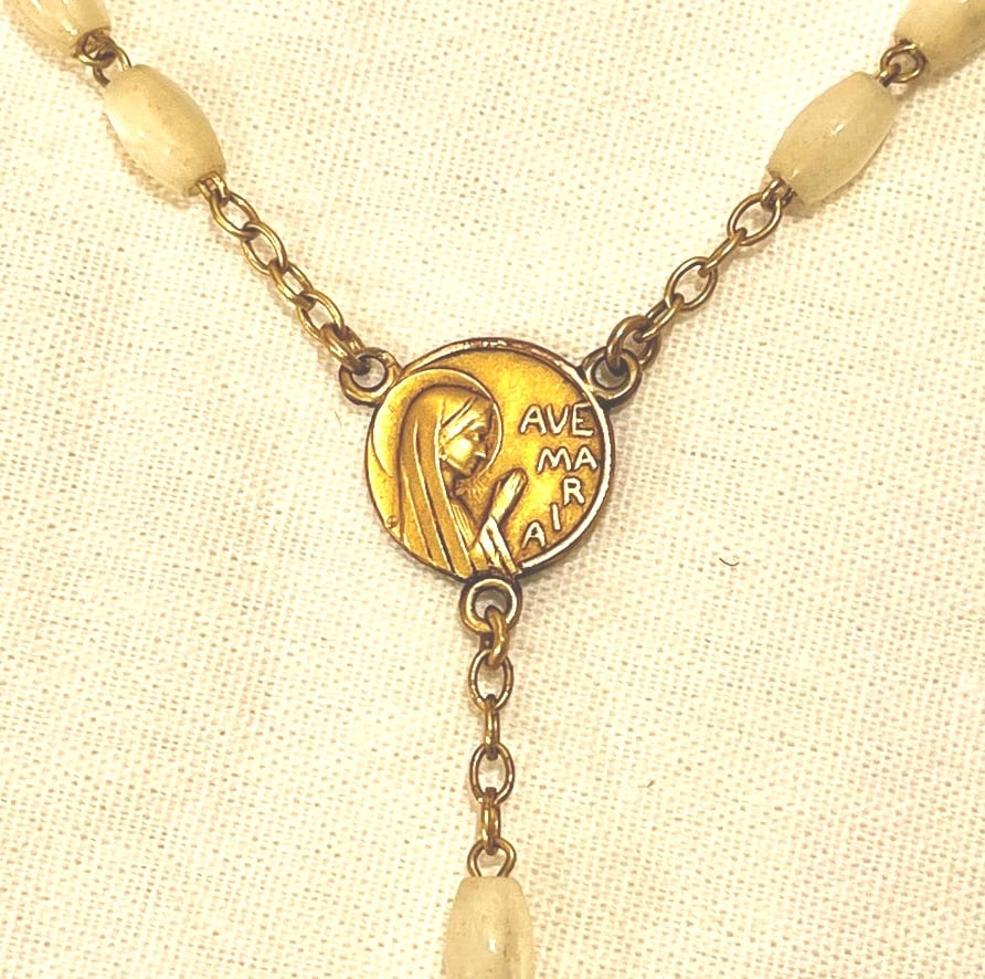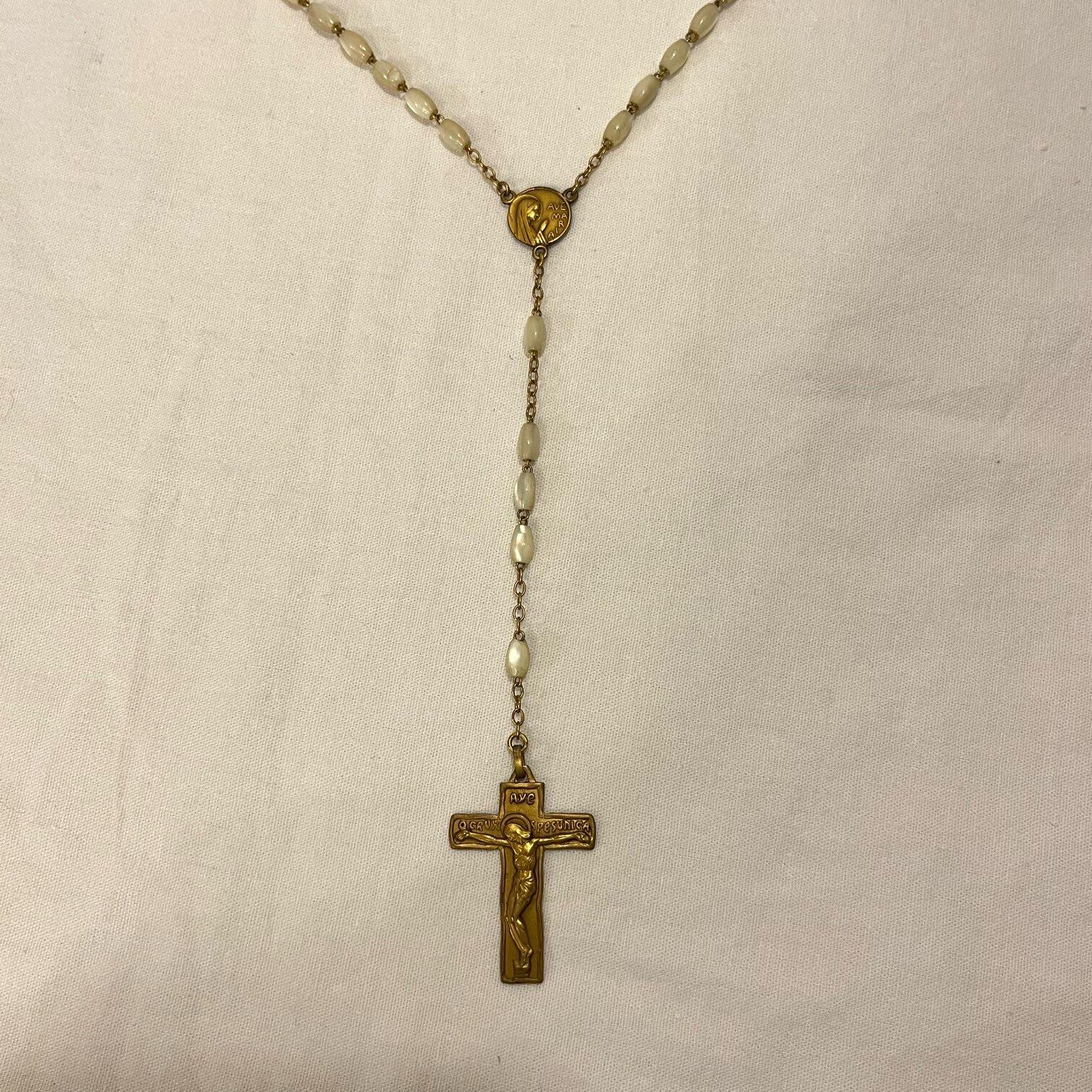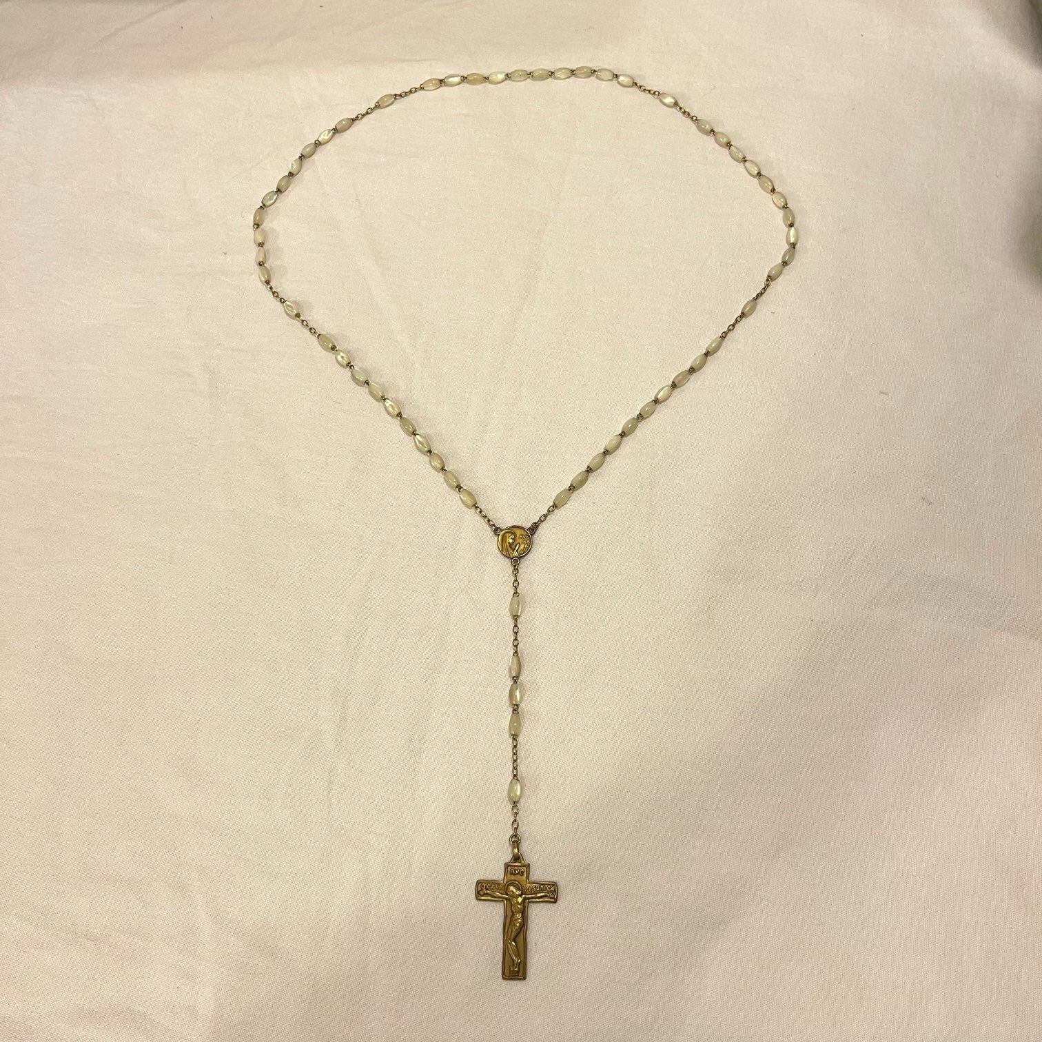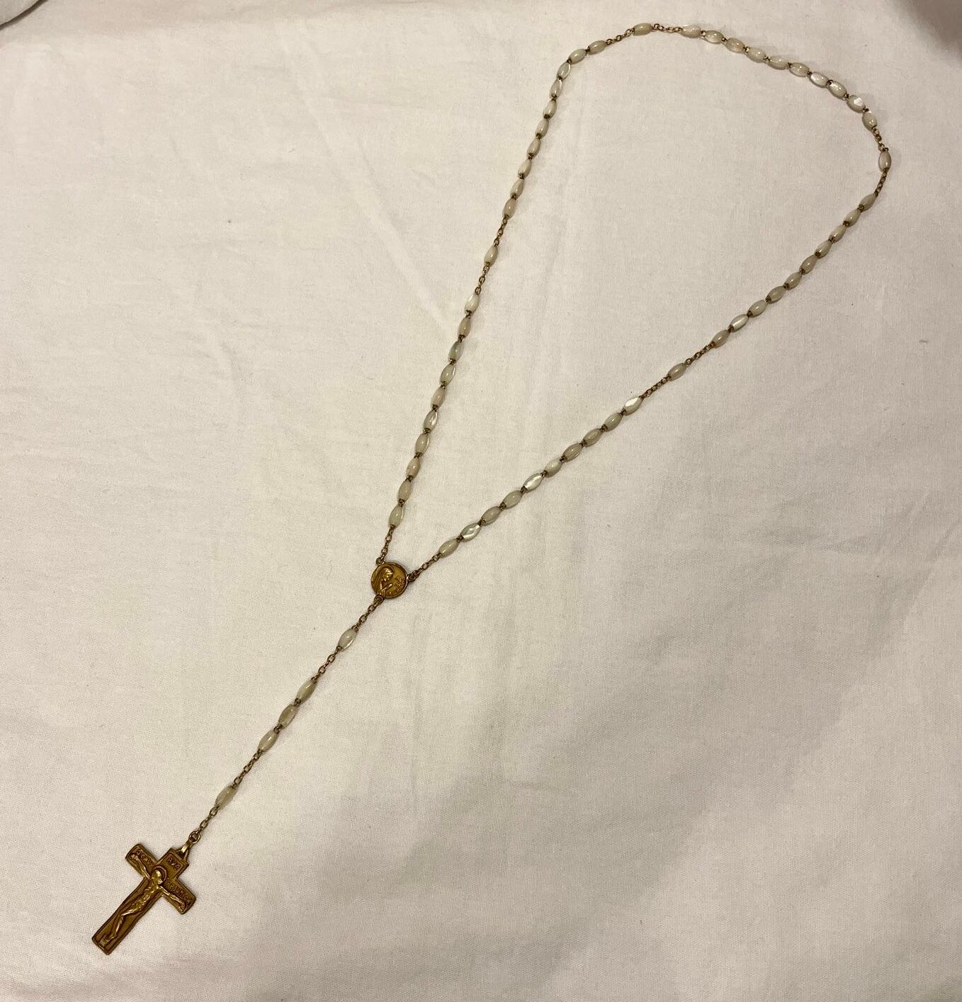 キラリと光るナックル(マザーオブパール)特有のアイボリーにゴールドクロスがポイントに効いたFrance antique ロザリオネックレス☆
