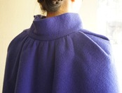 鮮やかな紫と黒の配色で、包み込むようなそのようなカーブのシルエット。3つのボタンがエッジの効いたスタンドカラーの首元から割れる直線が、とにかくお見事!