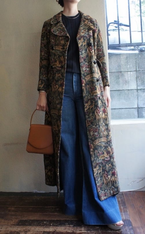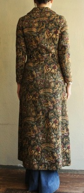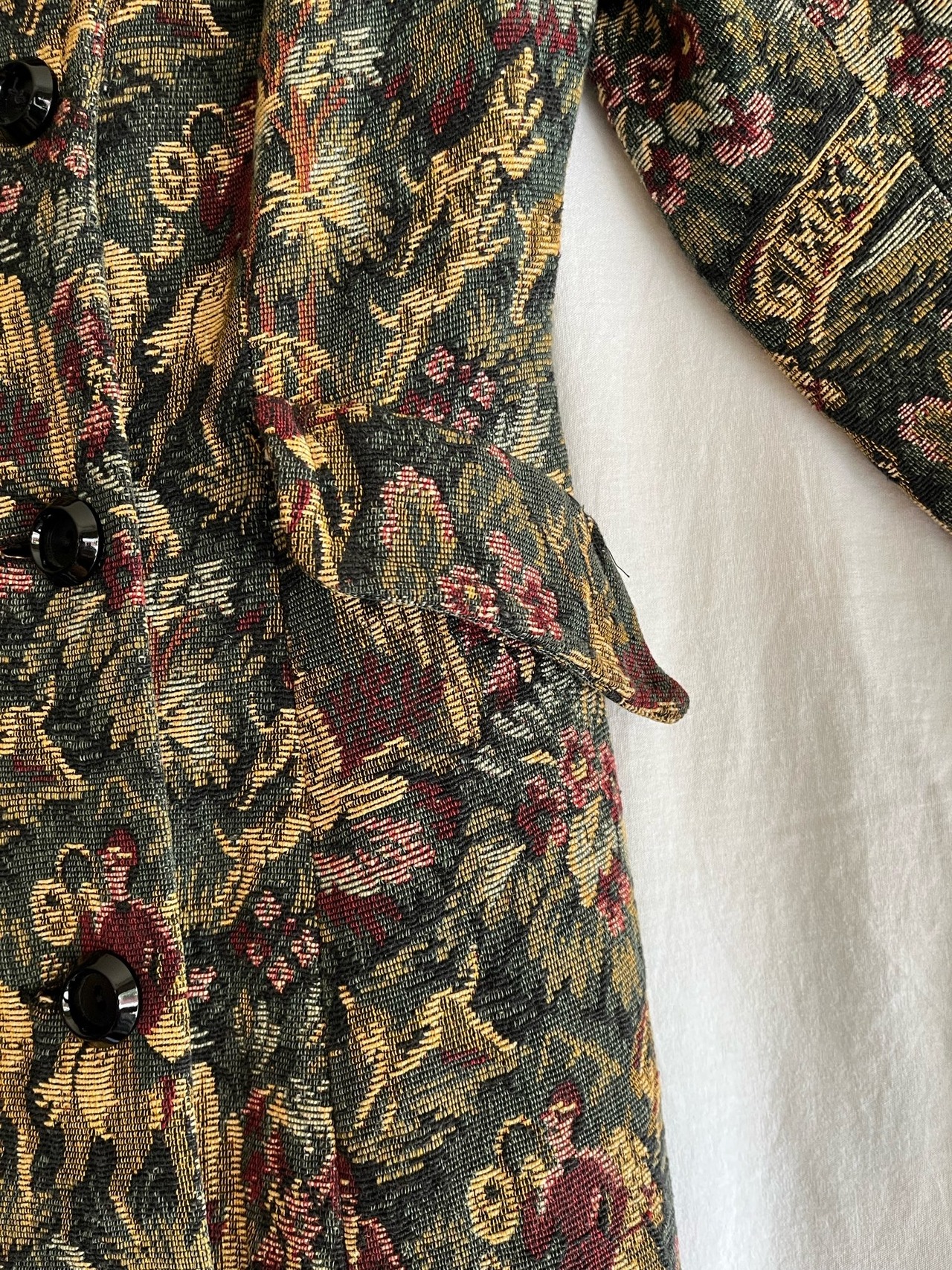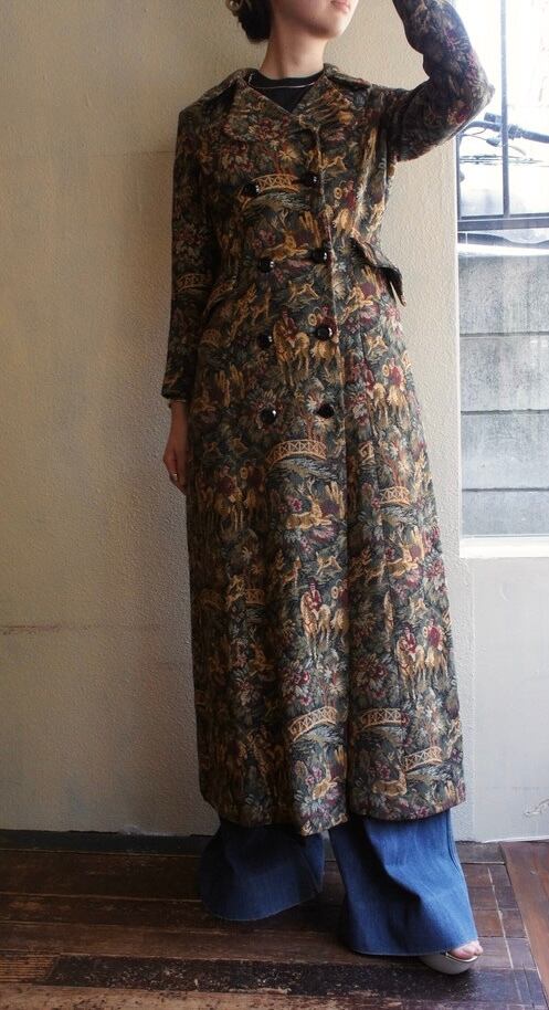 森の中の動物や、お花に囲まれた兵隊の絵画のようなジャガード織の超ロングコート、80-90’s England vintage, Handmade!