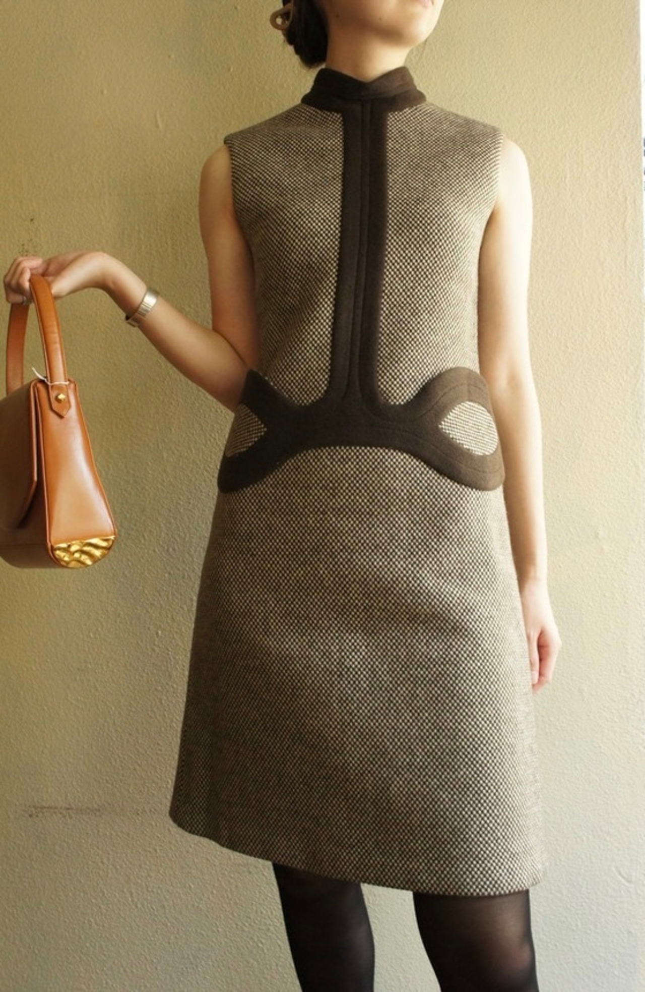 異素材ウールのハイネックの丸みと中央の直線のシルエットが、まさにフューチャリズム、Pierre Cardinらしいスマートな1点。