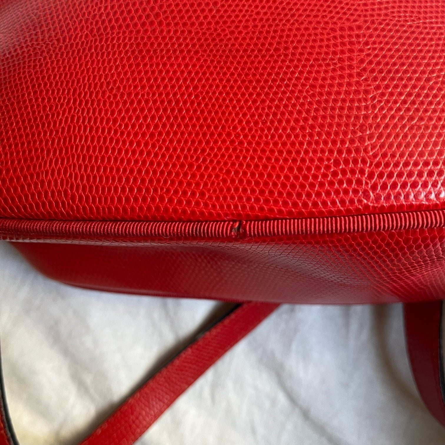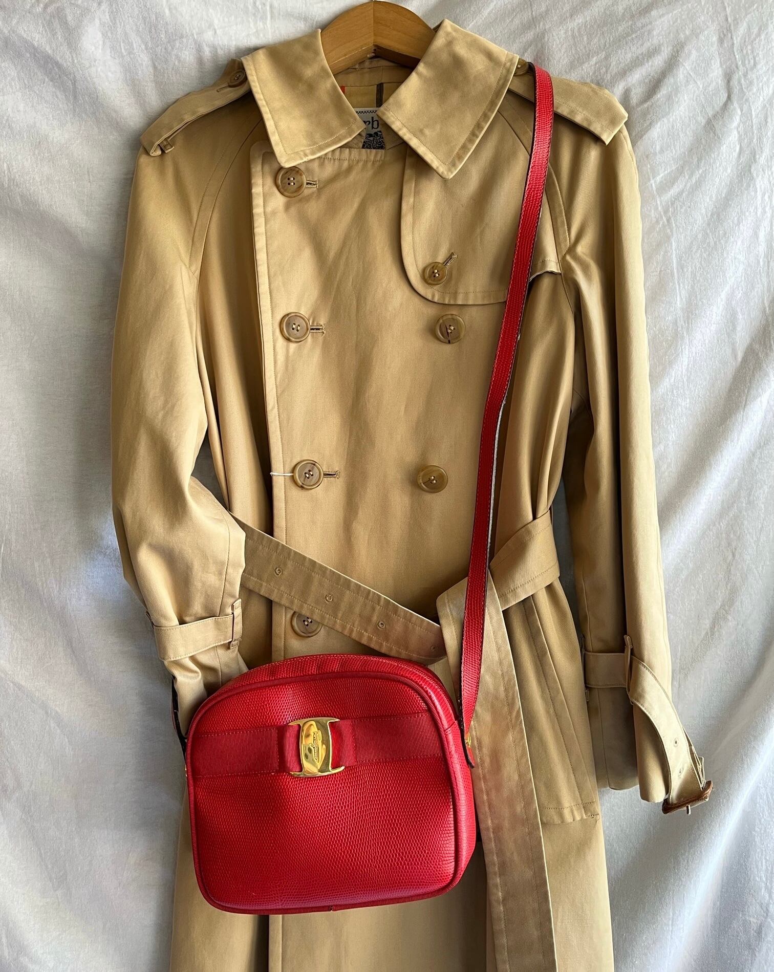 コーデのアクセントになるレッドカラーで、サイズ感も小さめのスクエアのシェイプがきゅっとしまり、エレガント。