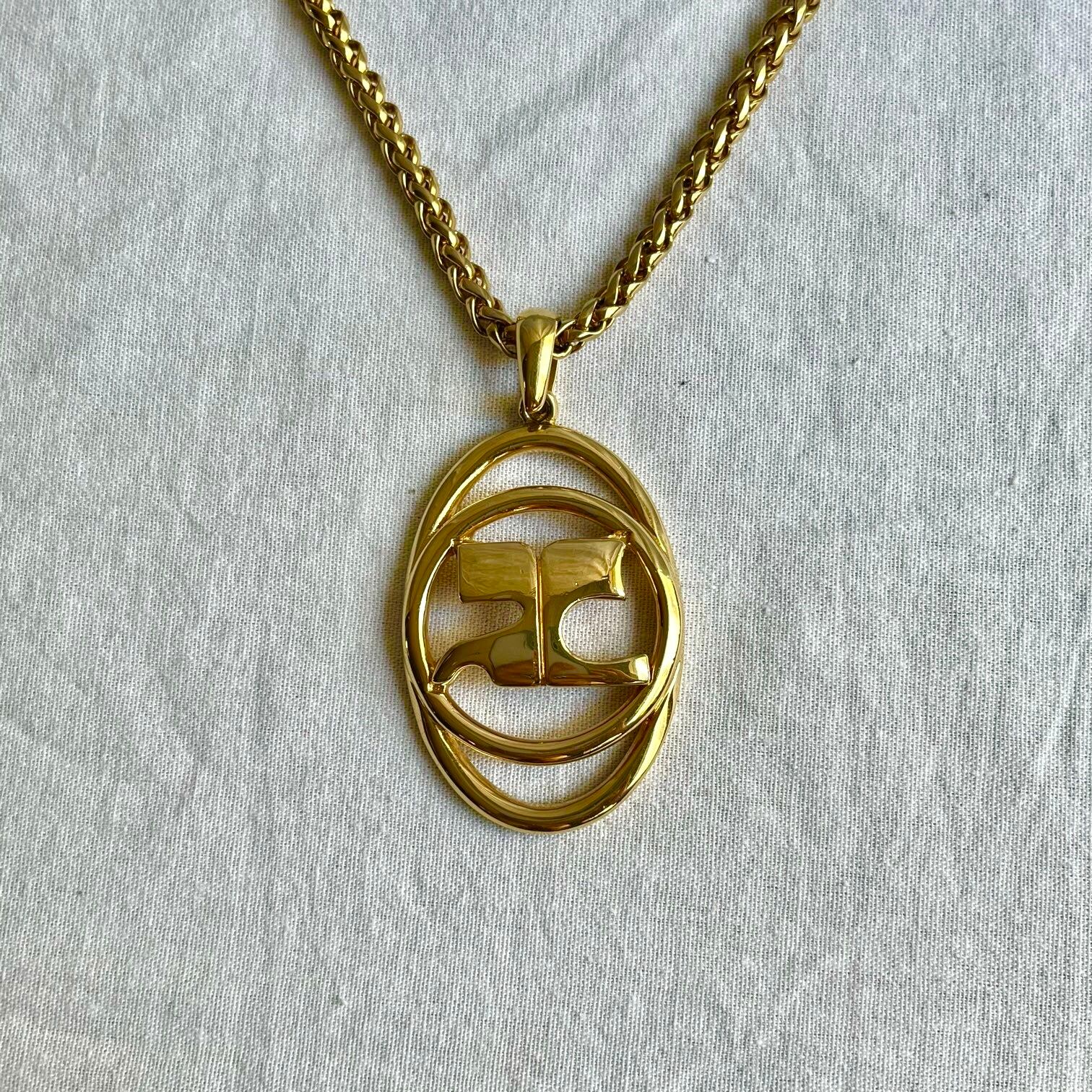 Courreges Gold metal big oval logo motif long Necklace — Rare!—