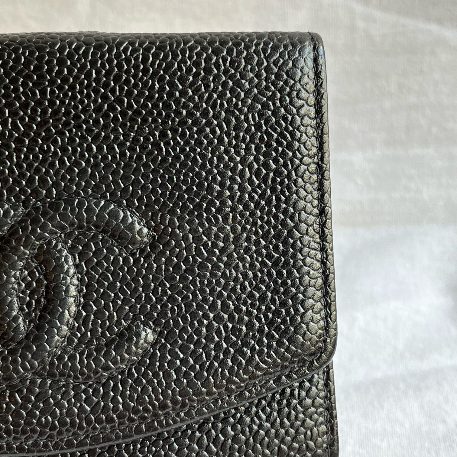 シャネルの人気キャビアスキンのお財布。ブラッ大きめシャネルロゴが高級感溢れる。