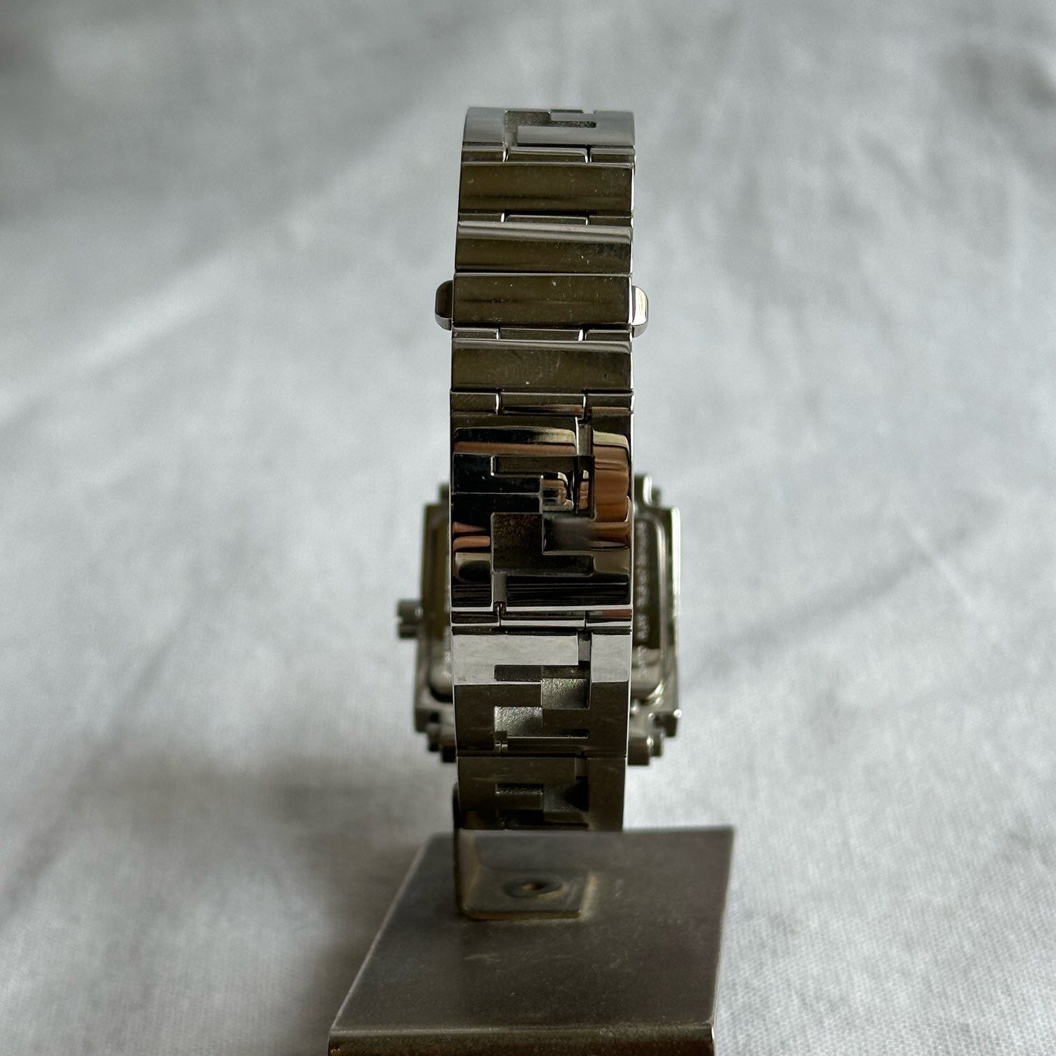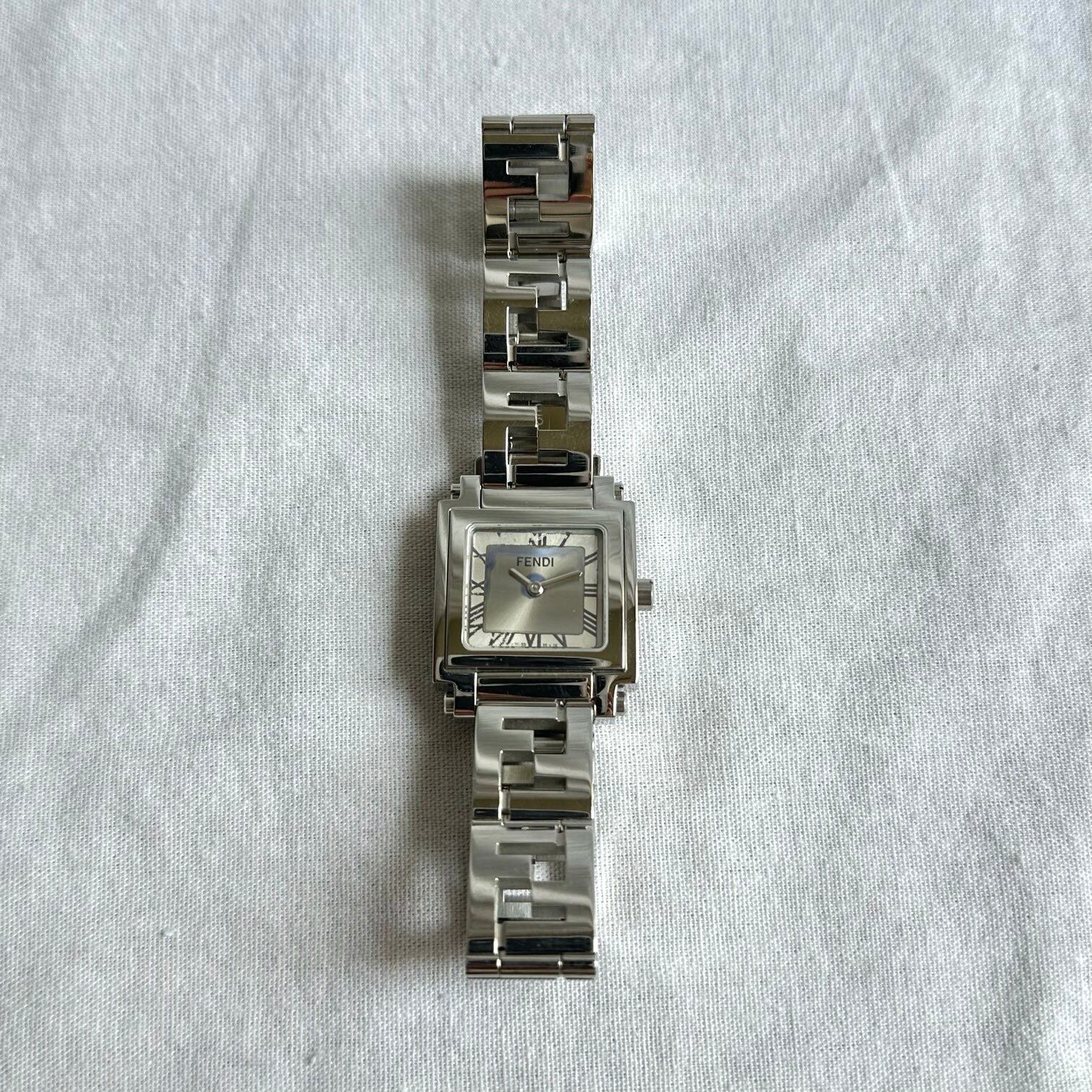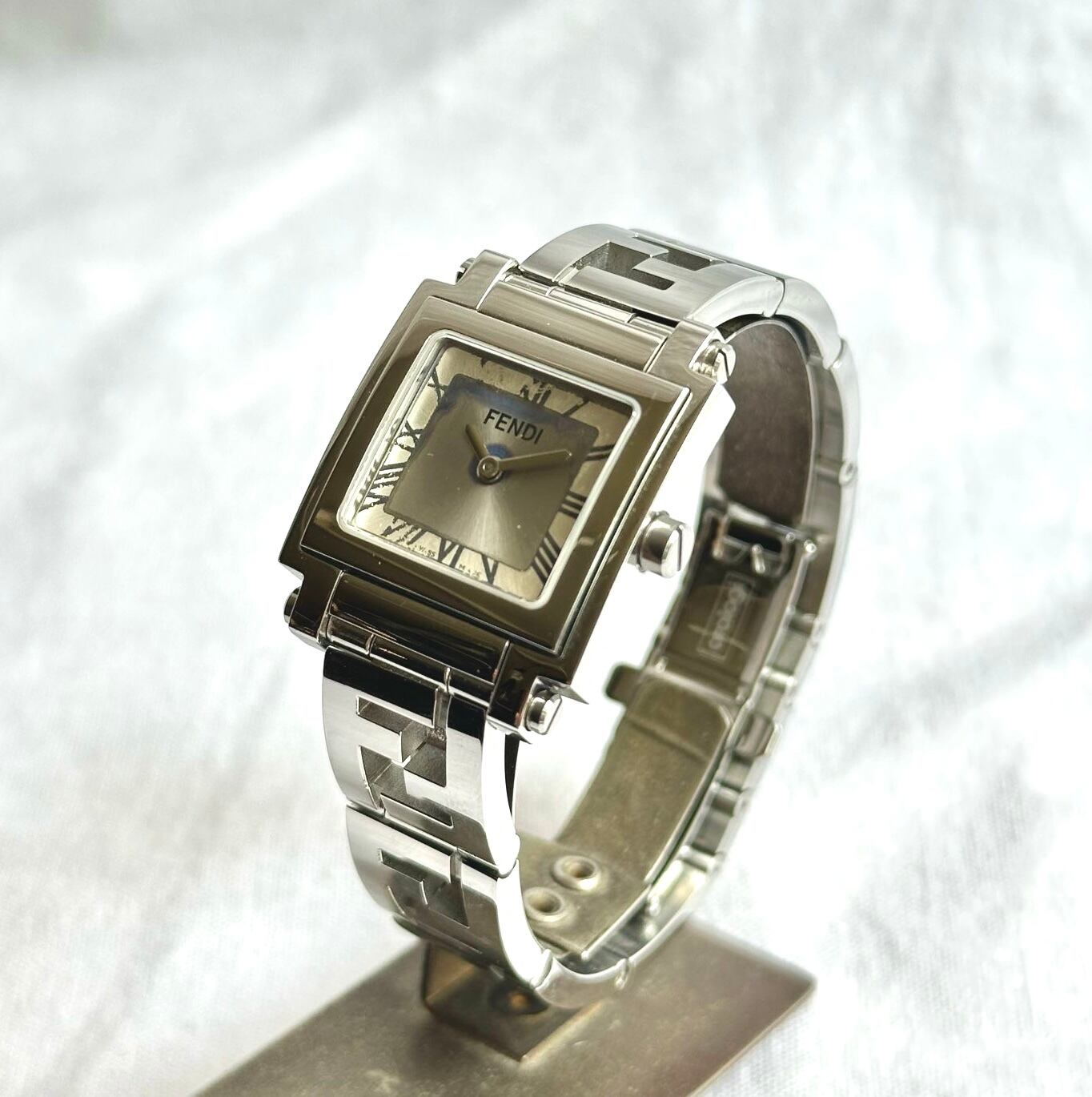 シルバーにスクエアのフェイスがクールなFENDI vintage watch!Fを上下交互にしたズッカ柄のアナグラムのデザインになっているベルトがスタイリッシュ!な一品。