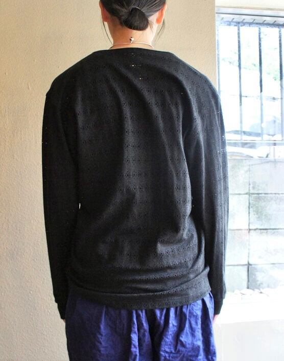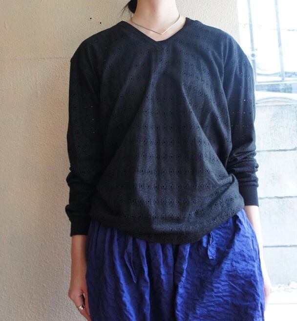 ブラックラメに細やかな型押しデザインがクラシカルなVersaceニットトップス。ゆったりとしたラインに型押しのシアーな作りは季節問わずに着られるアイテム☆