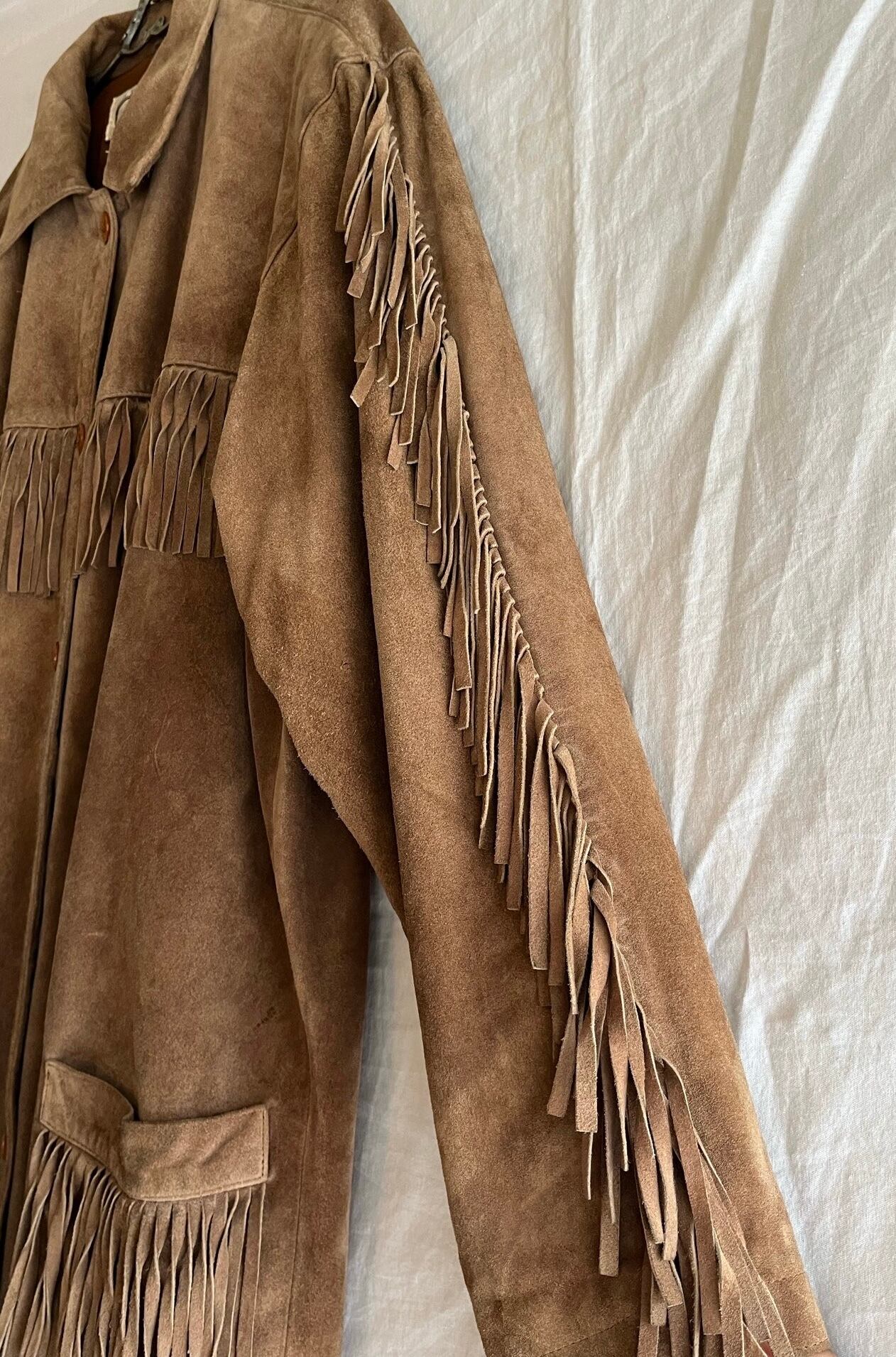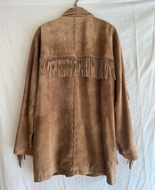 袖や身頃の長めのボリュームあるフリンジや後ろ見頃のレースアップなどウエスタンらしいで遊び心もポイント。しっかりと肉厚なスウェードで、柔らかいレザーのクオリティの高い一着です。
