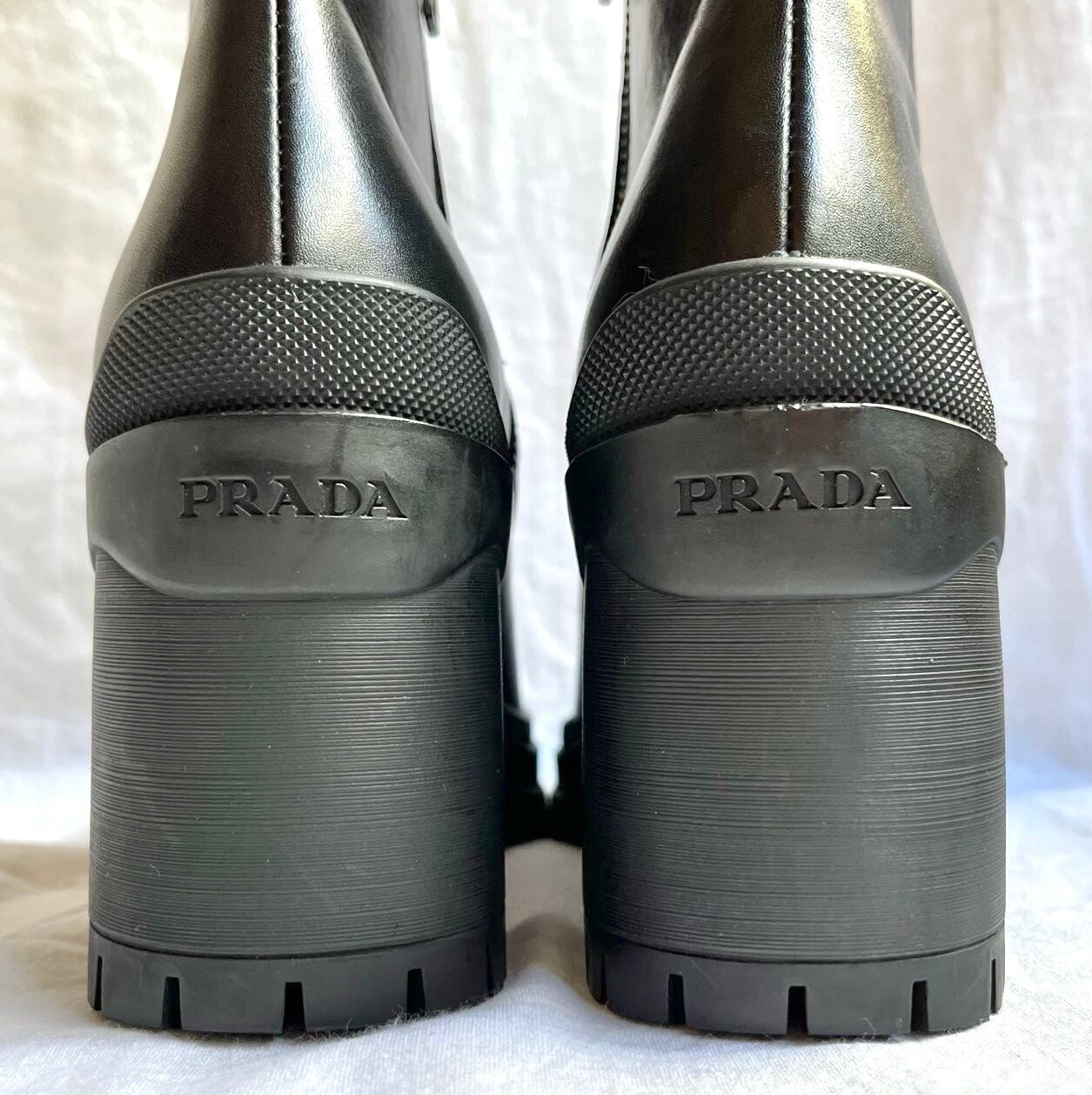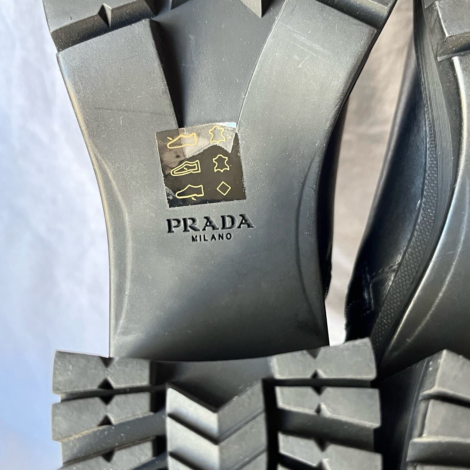 丸みのあるトゥに太めのヒールのバランスがクールなPRADAのショートブーツ。ミッドソールのゴムのラインやサイドにPRADAのロゴがスポーティさもありカジュアルなアイテムとの相性もGood!サイドジップも付いていて着脱のしやすさもデイリーに愛用できる一品です。