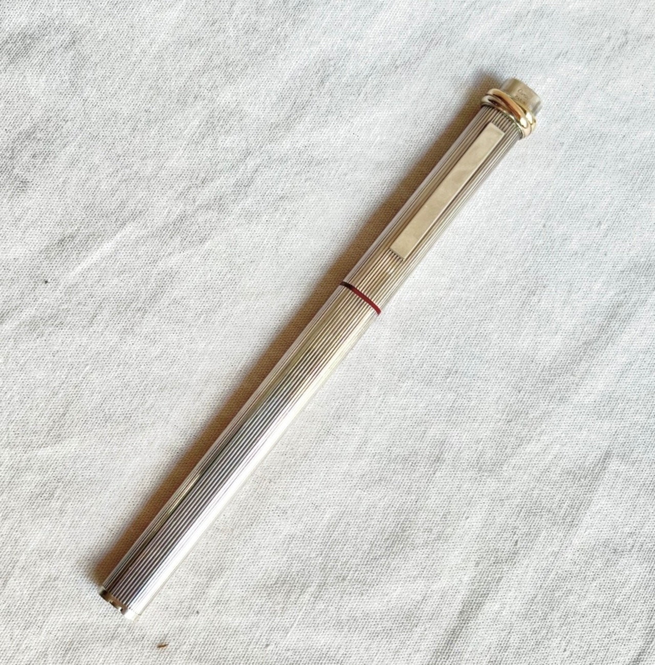 シルバーカラーの細かいストライプがスタイリッシュなCartierのボールペン、トリニティ。