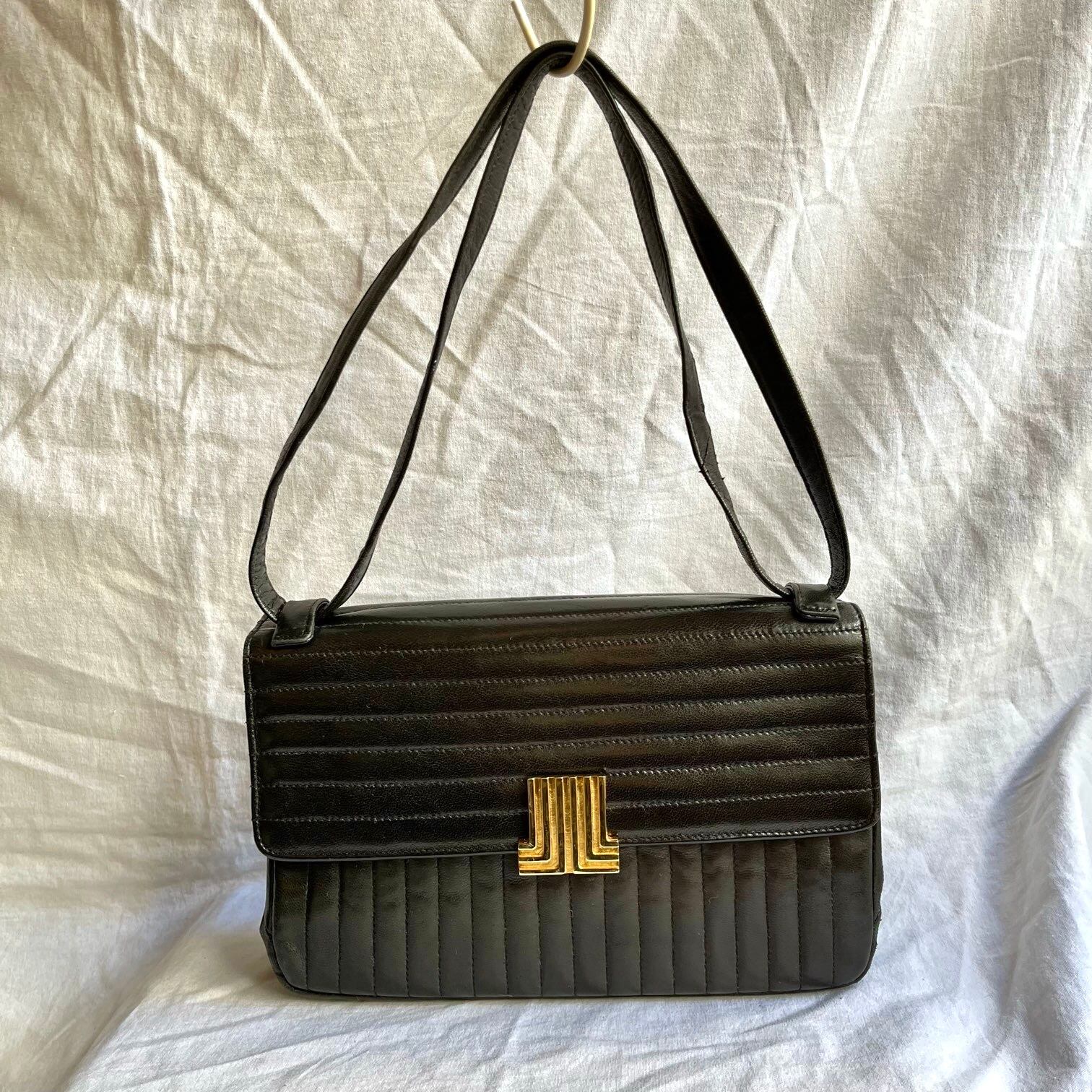 タテヨコのステッチがスタイリッシュなLANVIN 80’s 2way レザーバッグ☆スクエアのフォルムがスマートでクールな印象☆なめらかで上質なブラックレザーに内側もレザーになっておりこだわりあるデザイン。中央ゴールドのLANVINロゴもクールなポイント☆