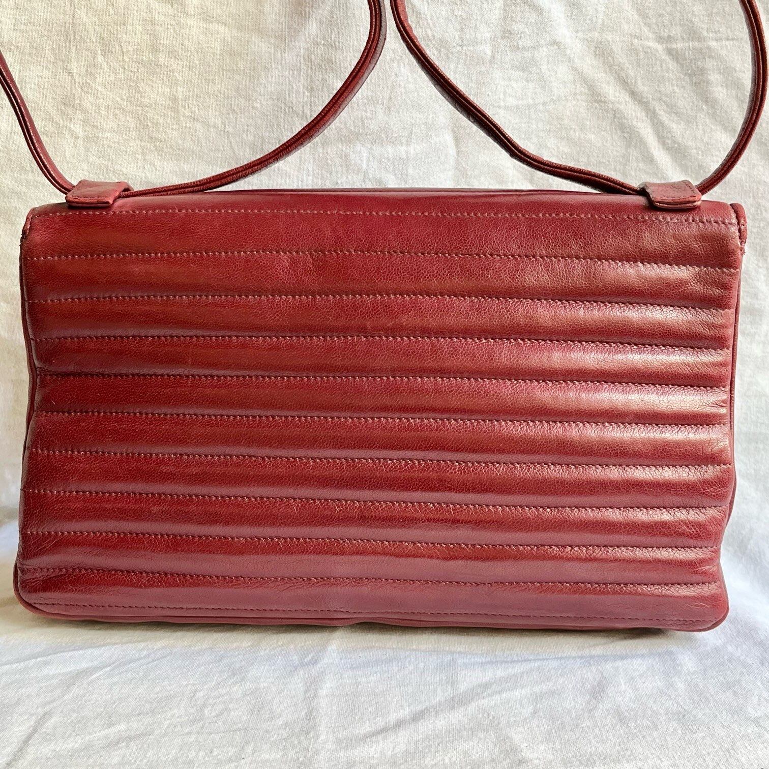 タテヨコのステッチがスタイリッシュなLANVIN 80’s 2way レザーバッグ☆スクエアのフォルムがスマートでクールな印象☆なめらかで上質なボルドーレザーが女性らしく内側もレザーになっておりこだわりあるデザイン。中央ゴールドのLANVINロゴもクールなポイント☆