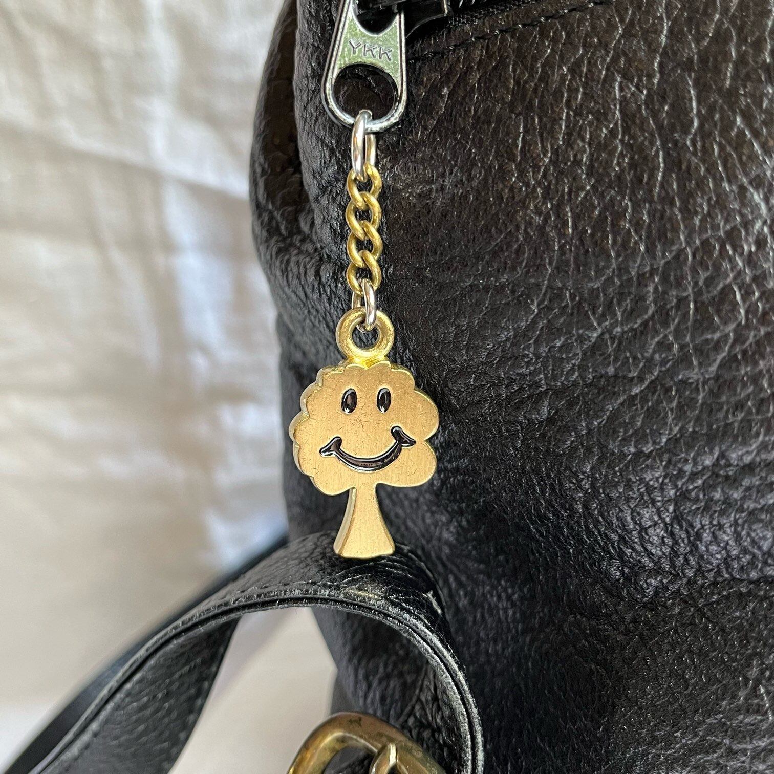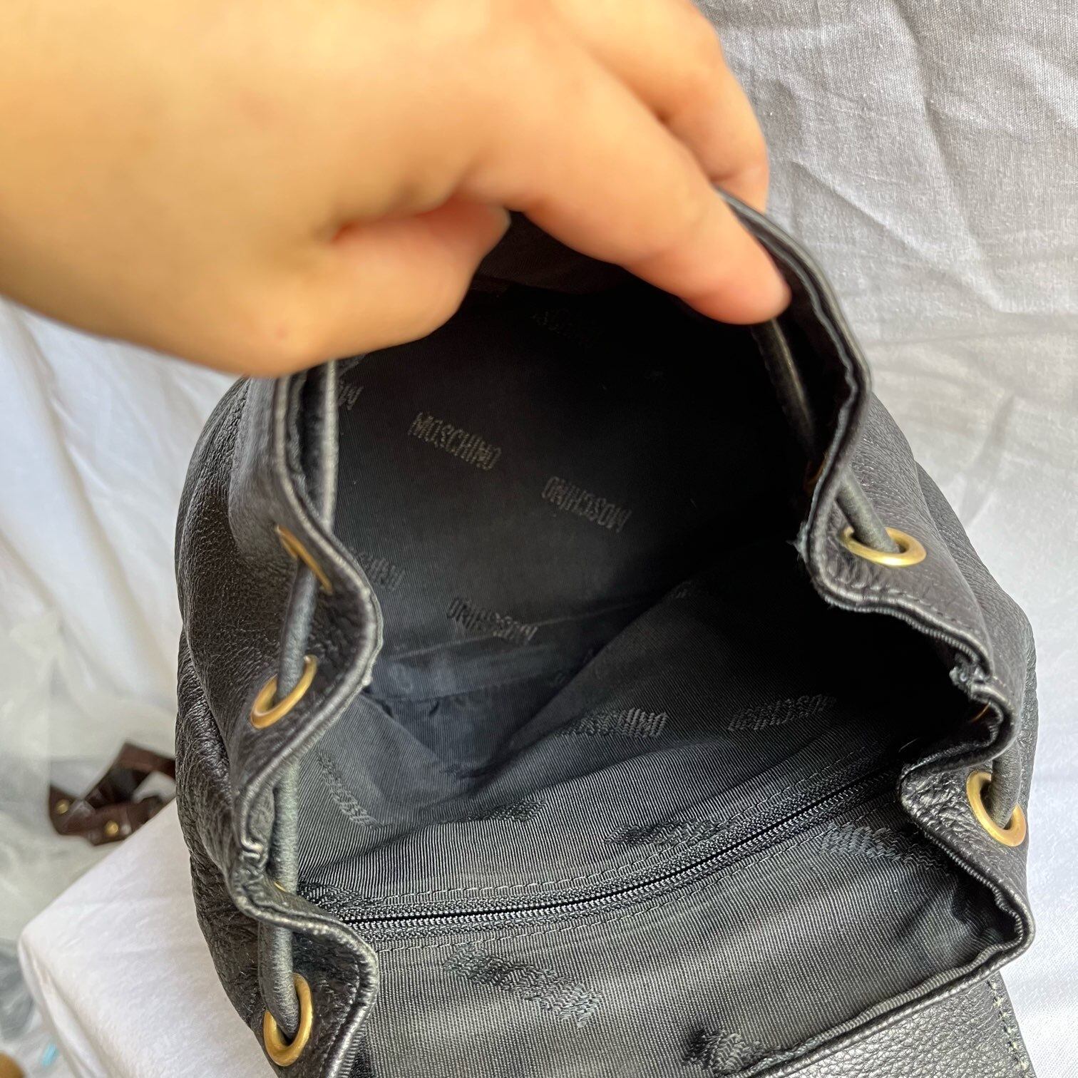 ストラップとファスナープルのスマイルマークがちらっと見える!コロンとしたコンパクトなフォルムのMOSCHINO ブラックレザーリュック。