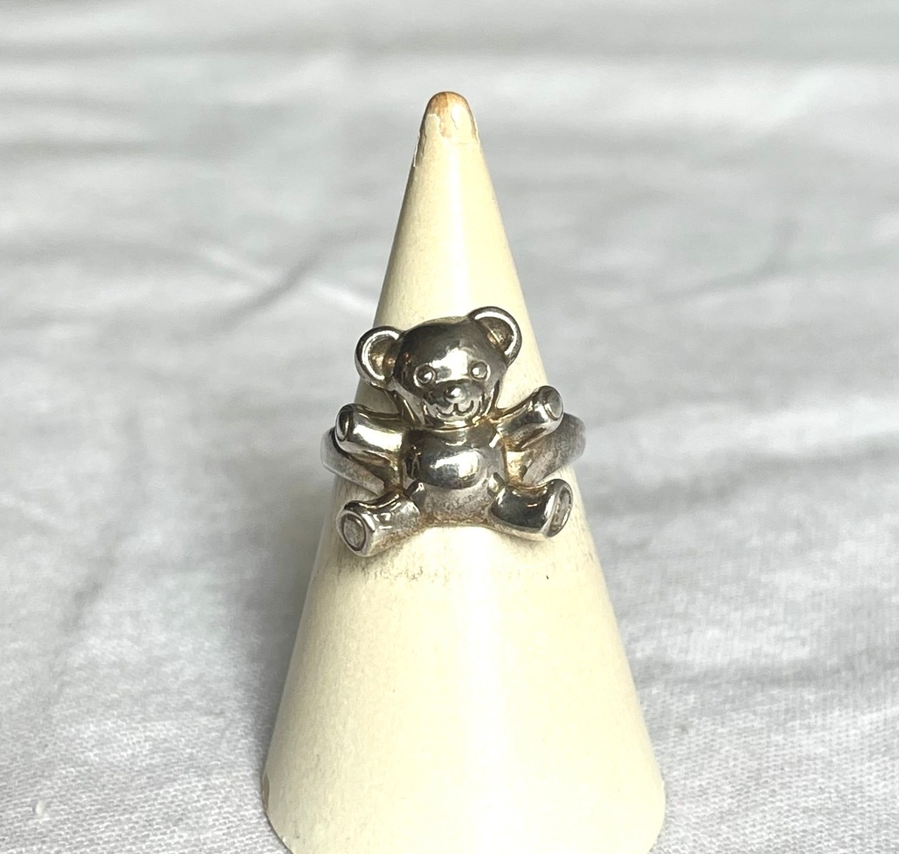 両手を広げたテディベアがなんともキュートなシルバーリング☆繊細で立体的な作りはキュートながらもこだわりのつまったデザイン。艶のあるシルバーがシックな雰囲気も兼ね備えた1点。