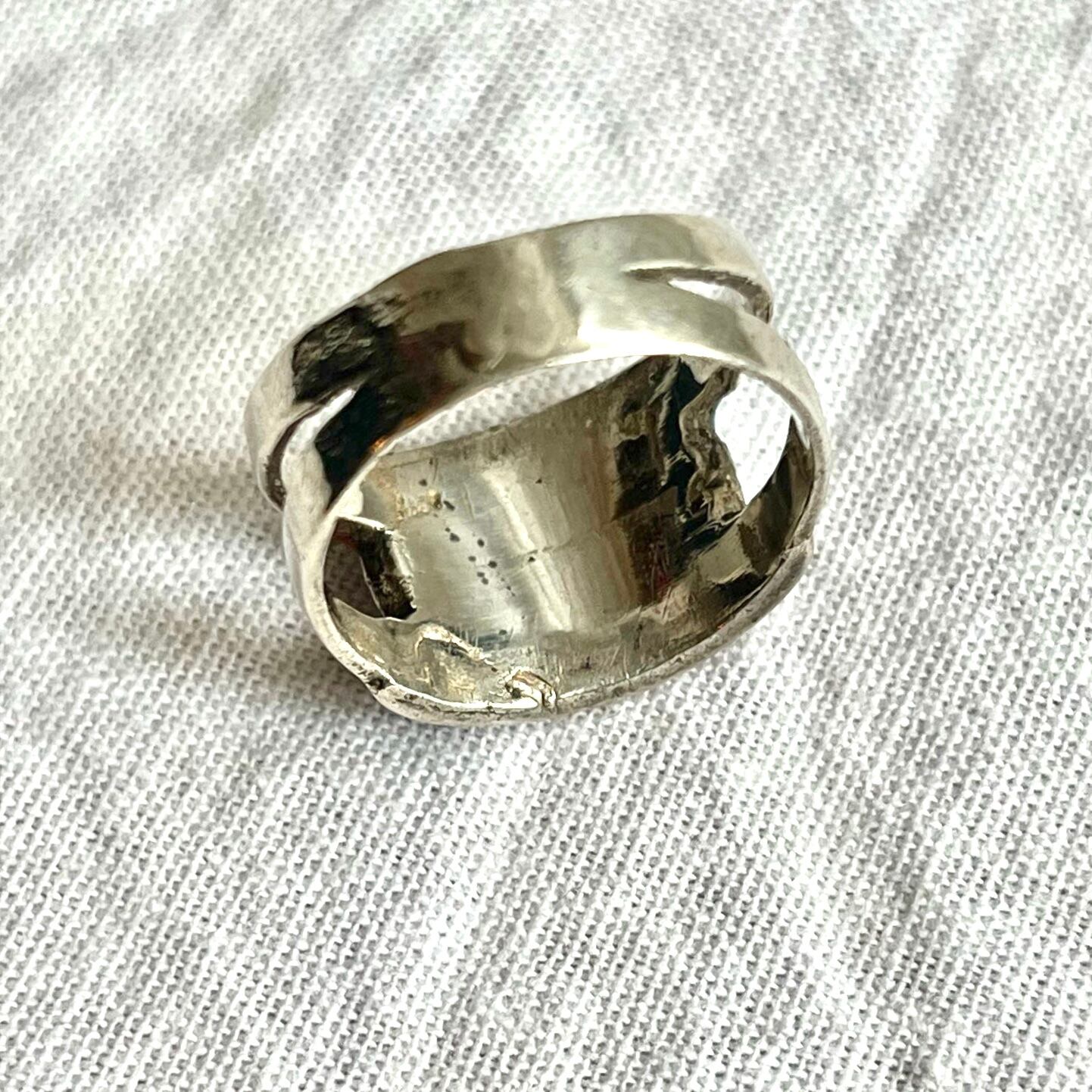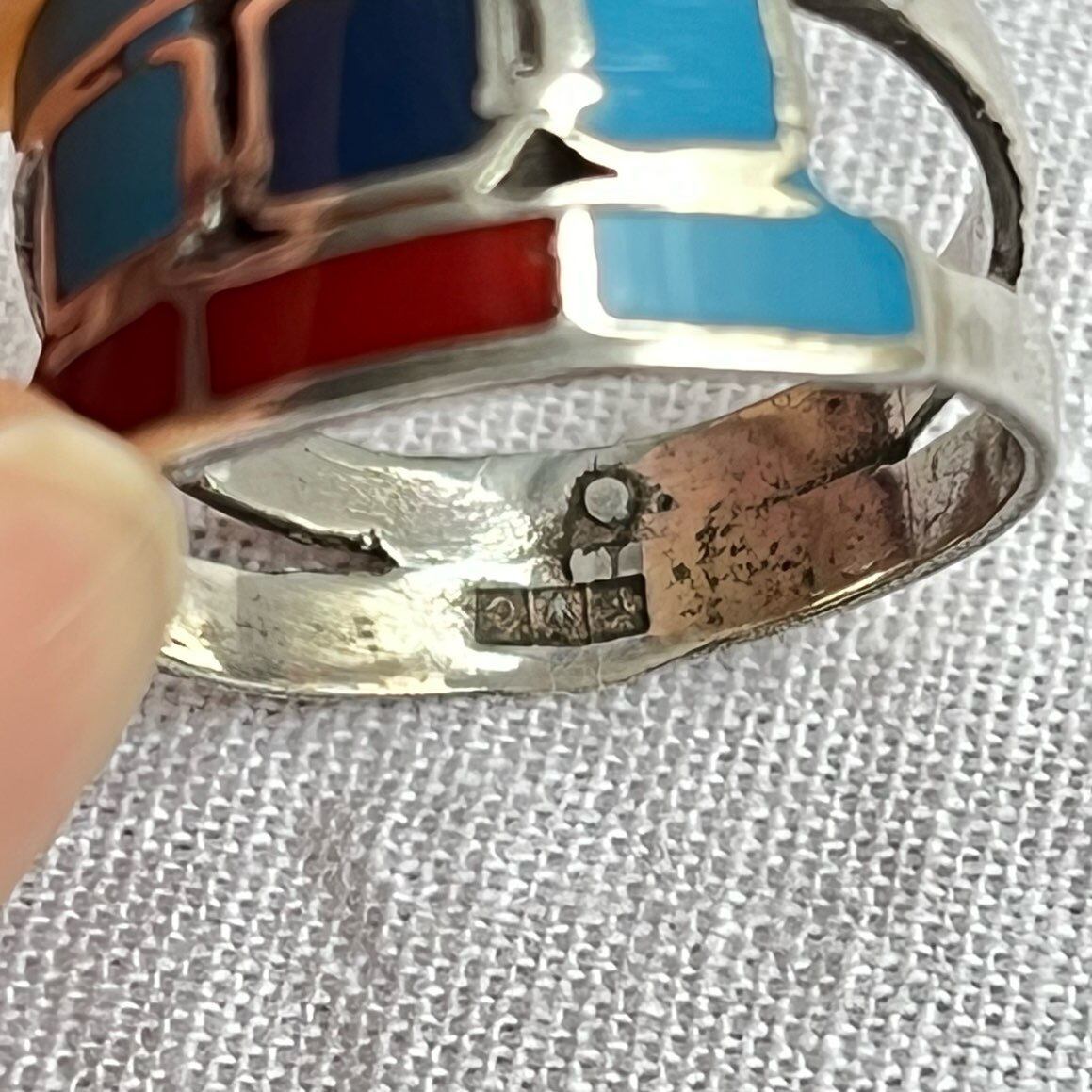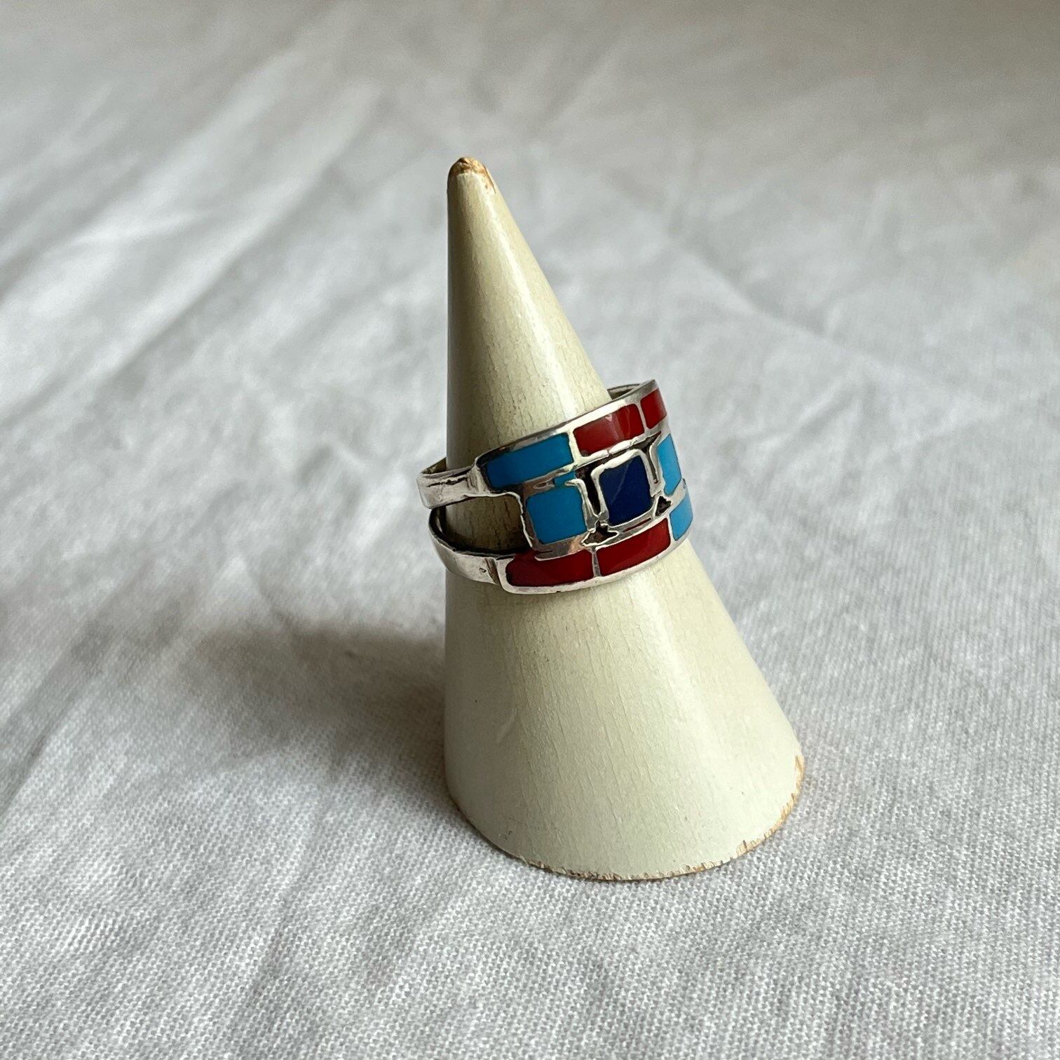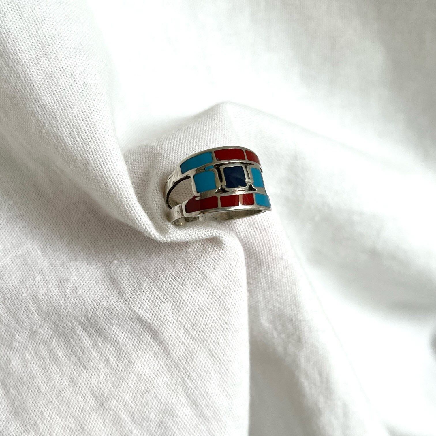 ターコイズブルー×レッド×ブラックのモザイクアートのデザインが目を惹くSilverリング。手作業で作られた独特な歪なフォルムがどこか暖かみのあるデザイン。サイドが二重になっていて抜け感もあり、手元を彩ってくれる特別な1点です。