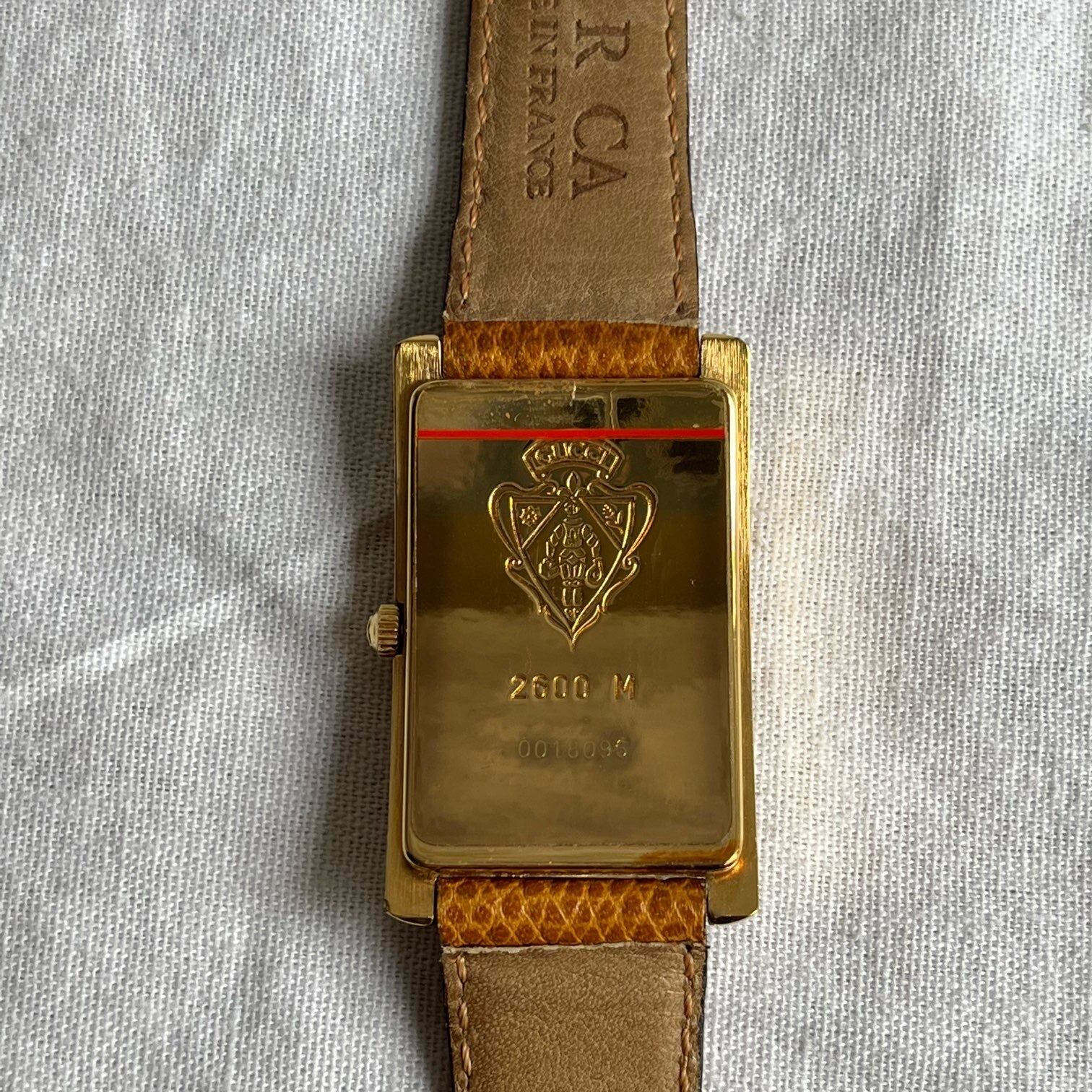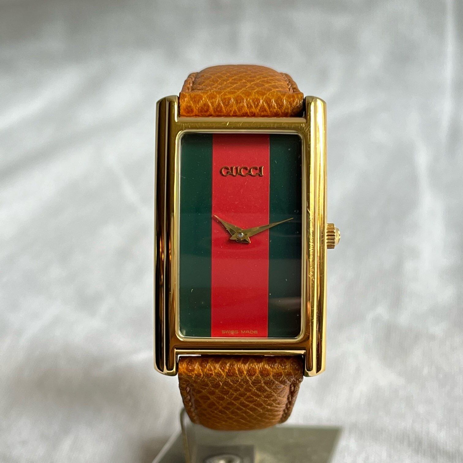 シェリーラインのフェイスがGUCCIらしいインパクトのあるvintage watch。スクエアで厚みのあるフェイスがエレガントなデザイン。ゴールドケースにライトブラウンのレザーが上品で付けやすくもコーディネートのポイントとなる1点。