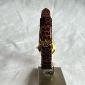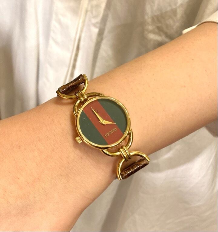 シェリーラインのフェイスがGUCCIらしさが極立つ,vintage watch。ゴールドラグのデザインと型押しレザーが相まって高級感ある上品なデザイン。落ち着いた色合いが手元を美しく魅せてくれる1点。