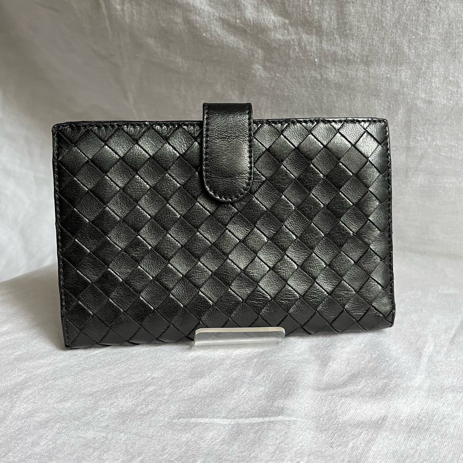 ブラックレザーのイントレチャートがBOTTEGAらしく高級感あふれる折りたたみ財布。しっとりとなめらかでしっかりと編み込まれたレザーはさすがBOTTEGAのハイクオリティさ。