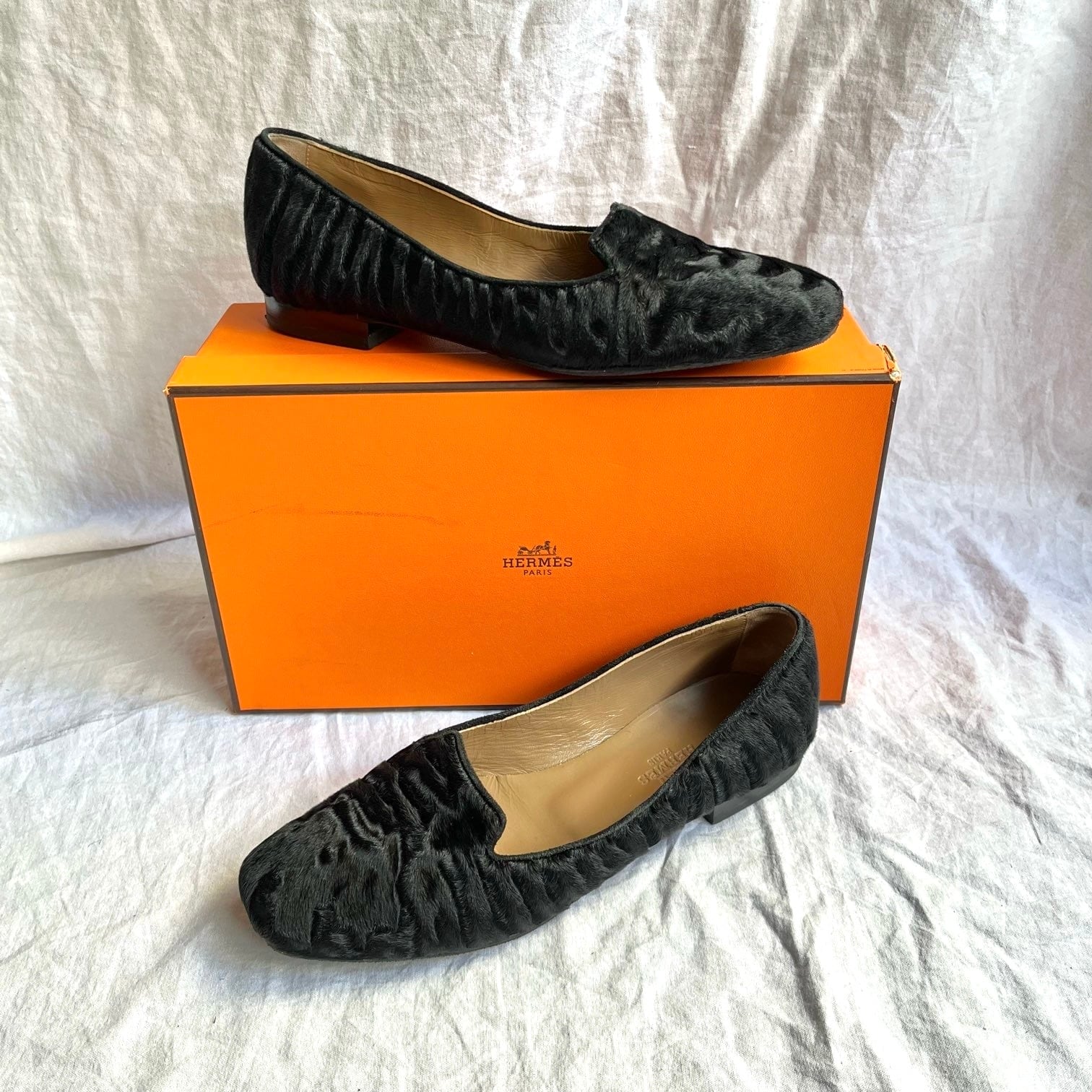 波を打ったようなハラコがキュートなHERMES フラットシューズ!深みのあるブラックがHERMESならではの高級感を漂わせます……程よいスクエアトゥと甲のデザインがスタイリッシュ。フラットで軽量なのも嬉しいポイント。