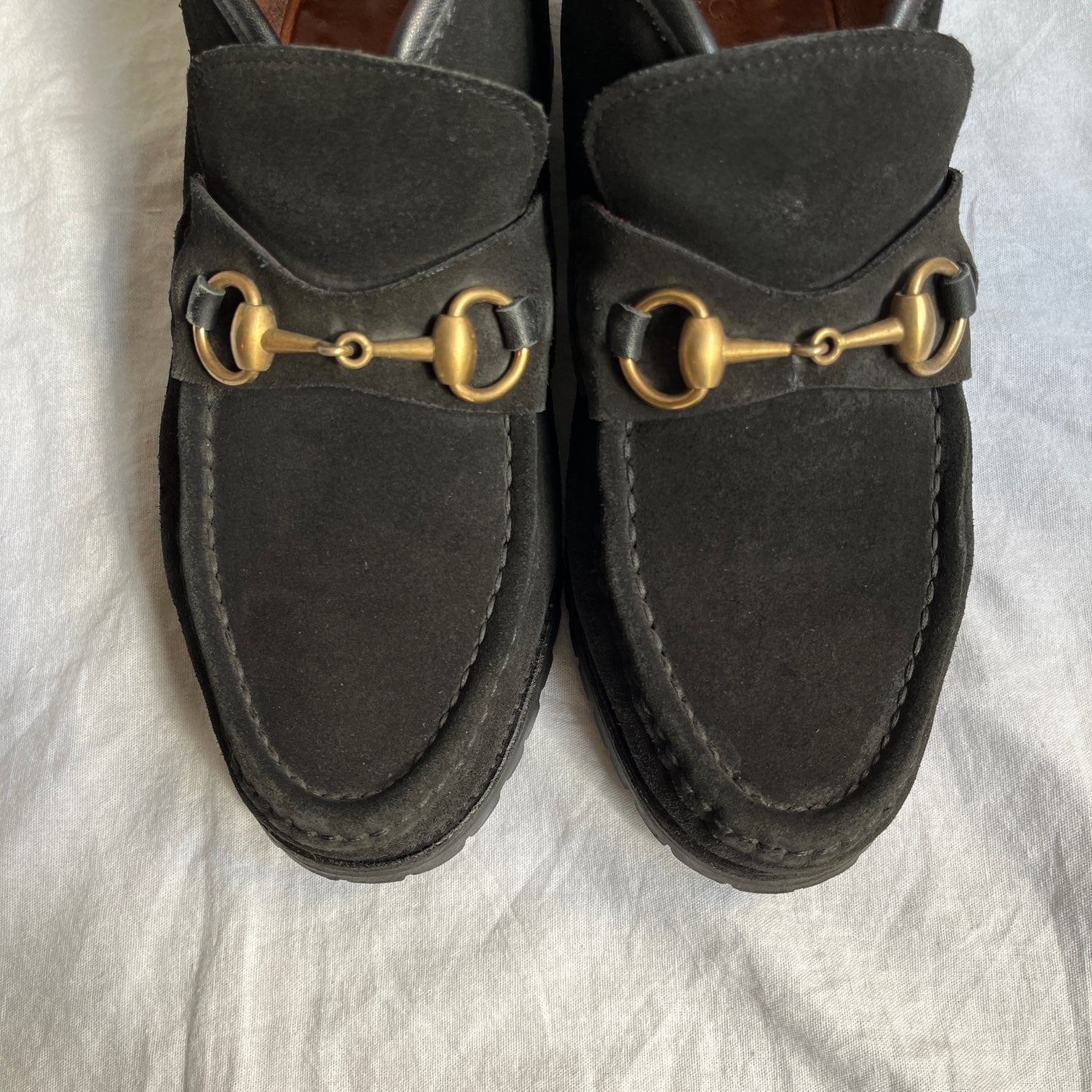 ブラックのスエードにゴールドのホースビットがクラシカルなGUCCIホースビット アンクルブーツ!スエード素材が重厚感あるデザイン。