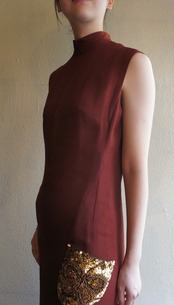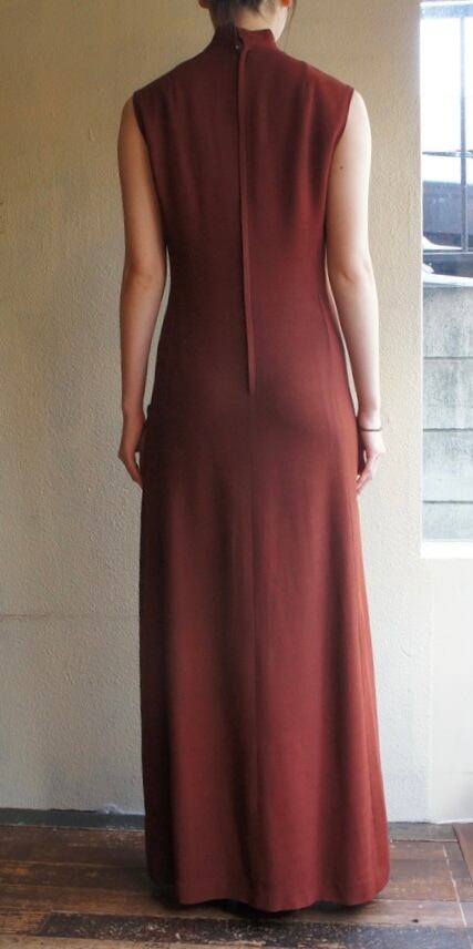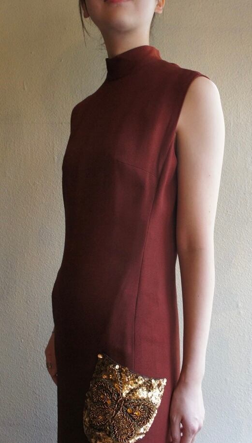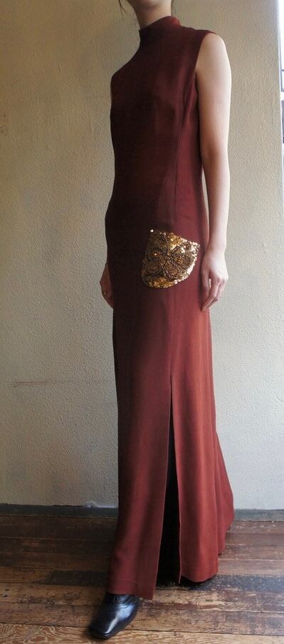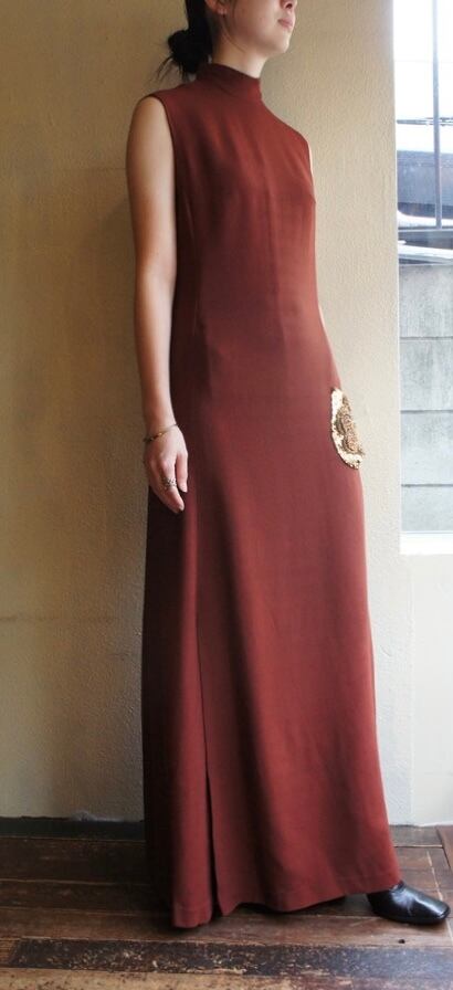 綺麗な明るいブラウンカラーにスパンコールやビーズのポケットがアクセントに効いたFrance 1970’s マキシドレス。スタンドカラーにノースリーブなど女性らしくエレガントな装い。前見頃の裾にダブルのスリットが色っぽく、歩きやすい!