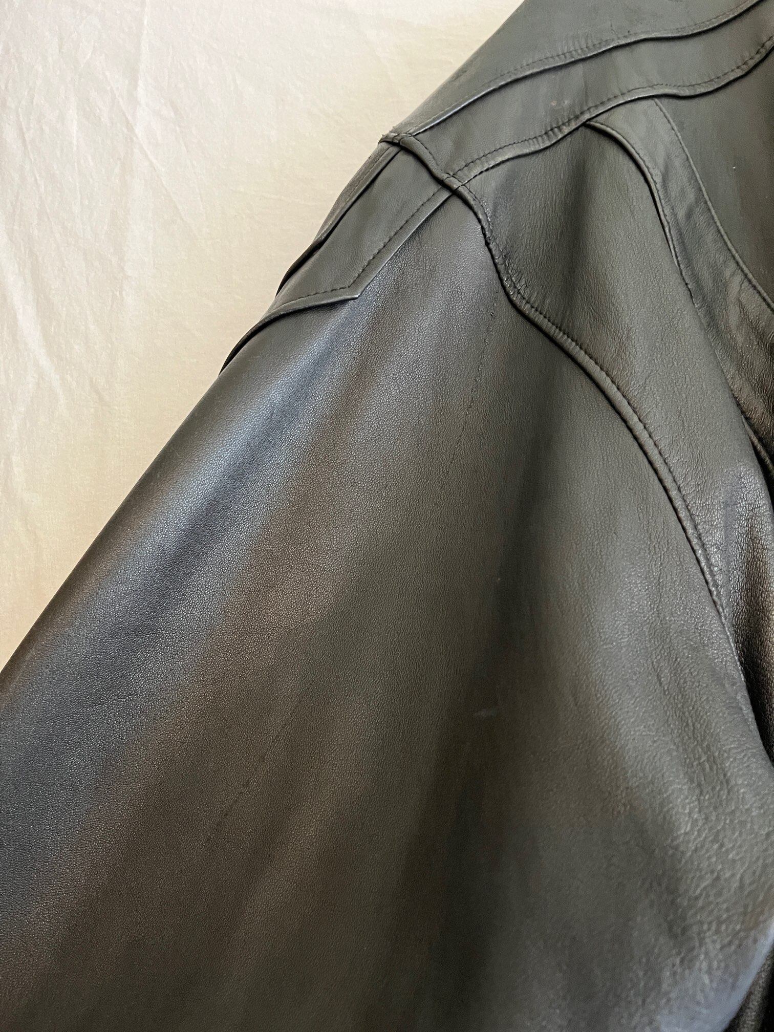 ゆったりとしたサイズ感切り替えやステッチがクールでモード!アームも広く、厚手のニットでもひびかないシルエット。首元のベルトのデザインやポケットが二重になっていたり所々にこだわりのあるポイントが。唯一無二なスペシャルなレザーブルゾンです。裏地つきで厚地の柔らかレザーが防寒性がある割に、軽く着やすいです。