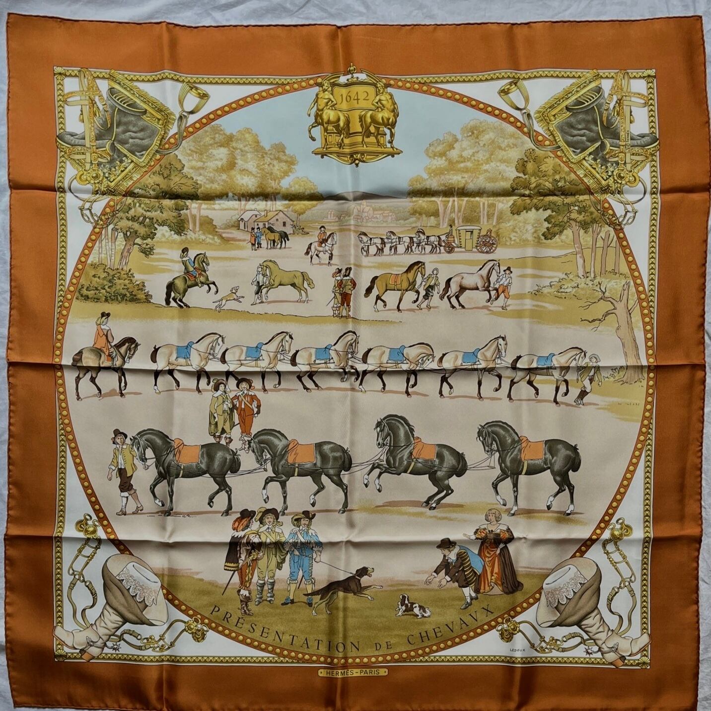 “馬のプレゼンテーション”と記されたHERMESで人気のあるカレスカーフ。あたたかみのある色合いに賑やかな様子が優しい印象のデザイン。馬や犬の細やかな描写もキュート!ブラウンカラーでコーディネートにも取り入れやすい1点。
