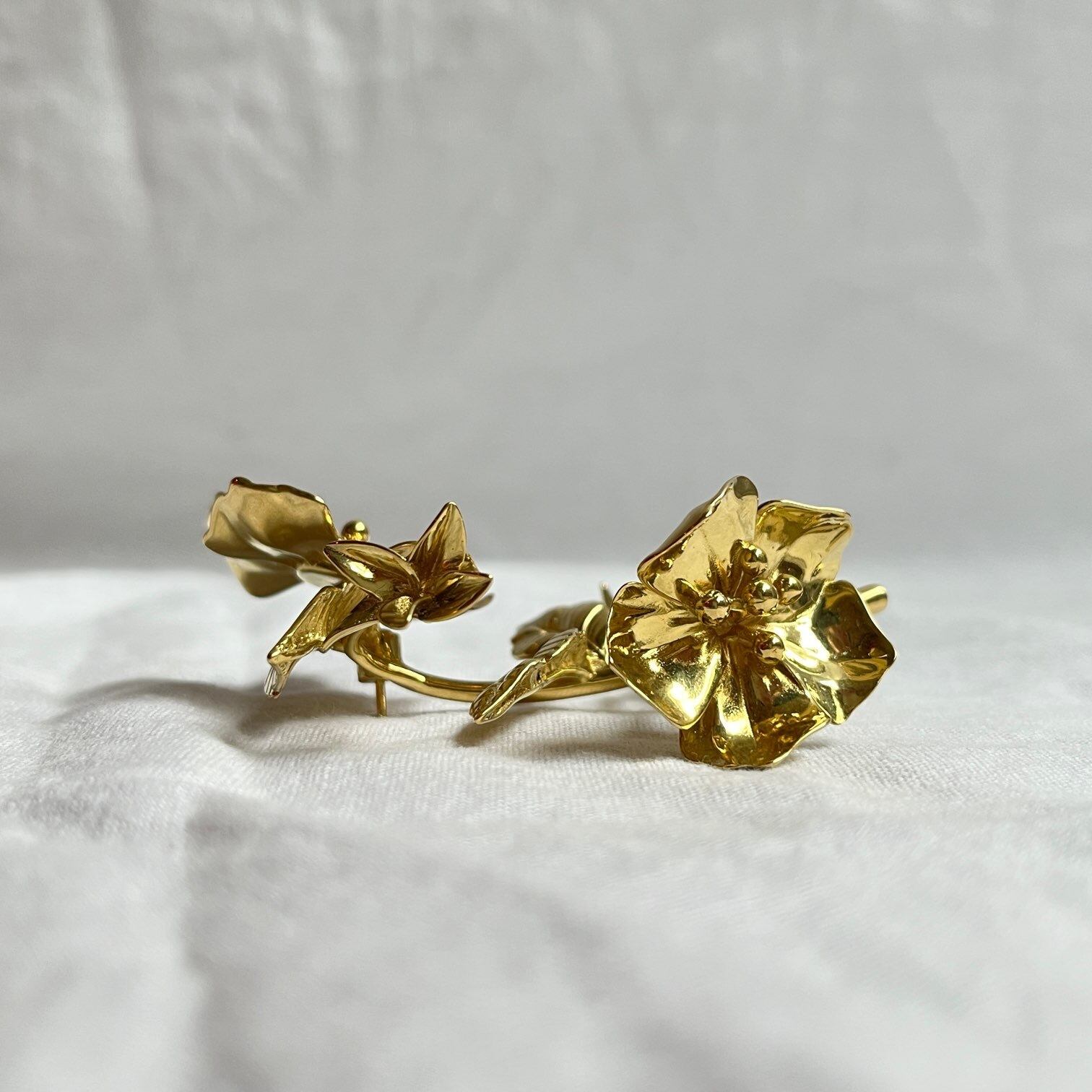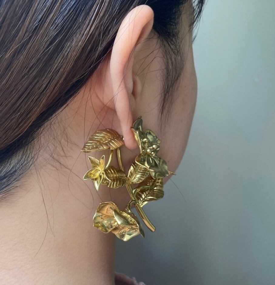 艶のあるゴールドが気品あふれるElsa Schiaparelli の片耳ピアス。一輪の花を大胆にピアスとして表現するアバンギャルドさはさすがスキャバレリ。耳元が華やかになるエレガントさは特別な日やパーティーにオススメです。