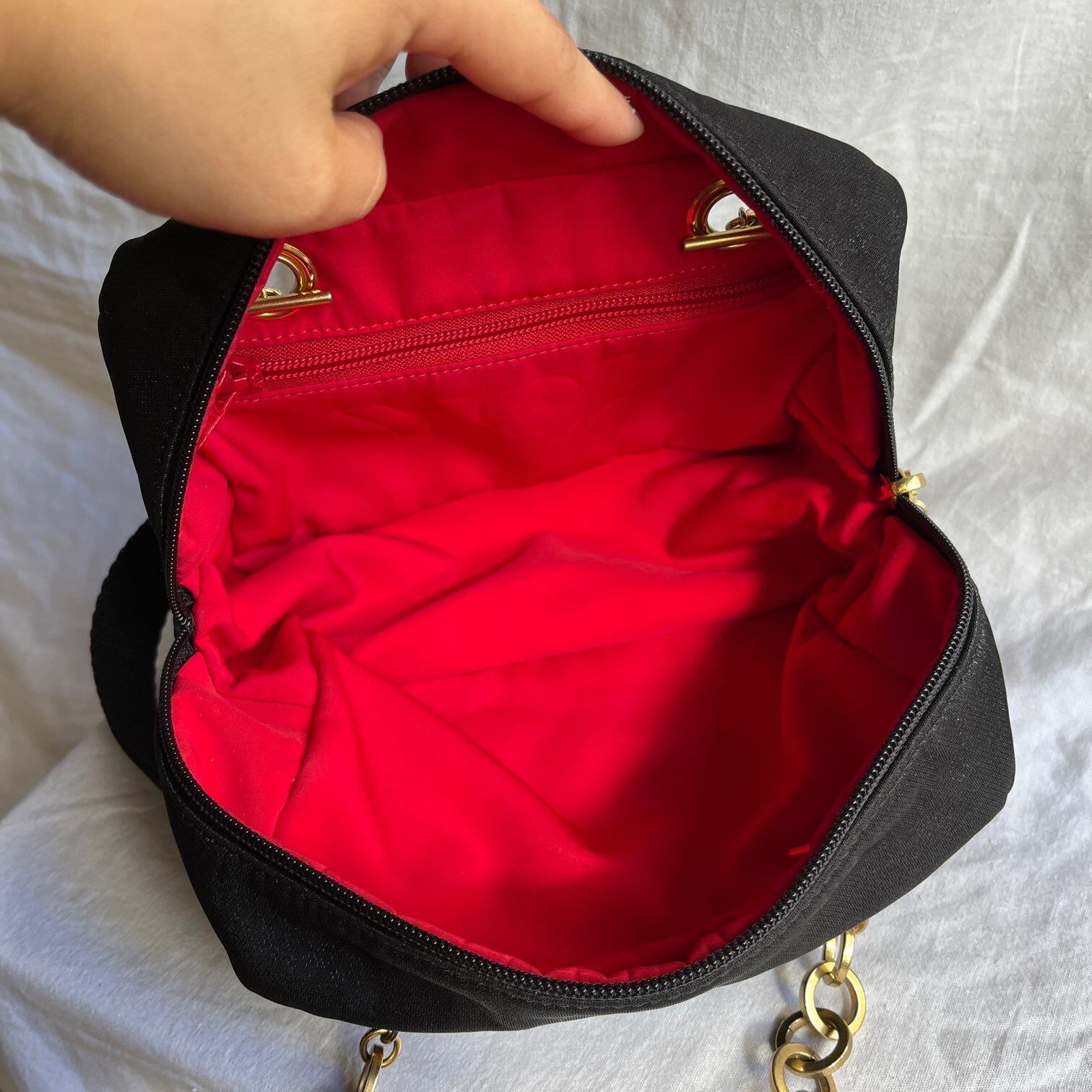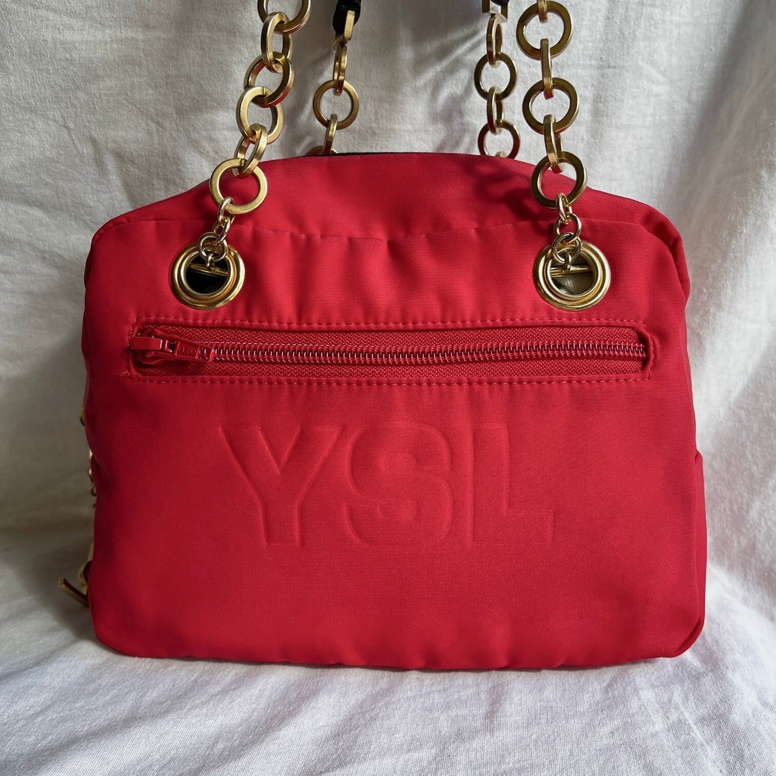 ブラック, レッドのグリッターのナイロン地にゴールドチェーンがアクセントになったYSLのショルダーバック、リバーシブル!