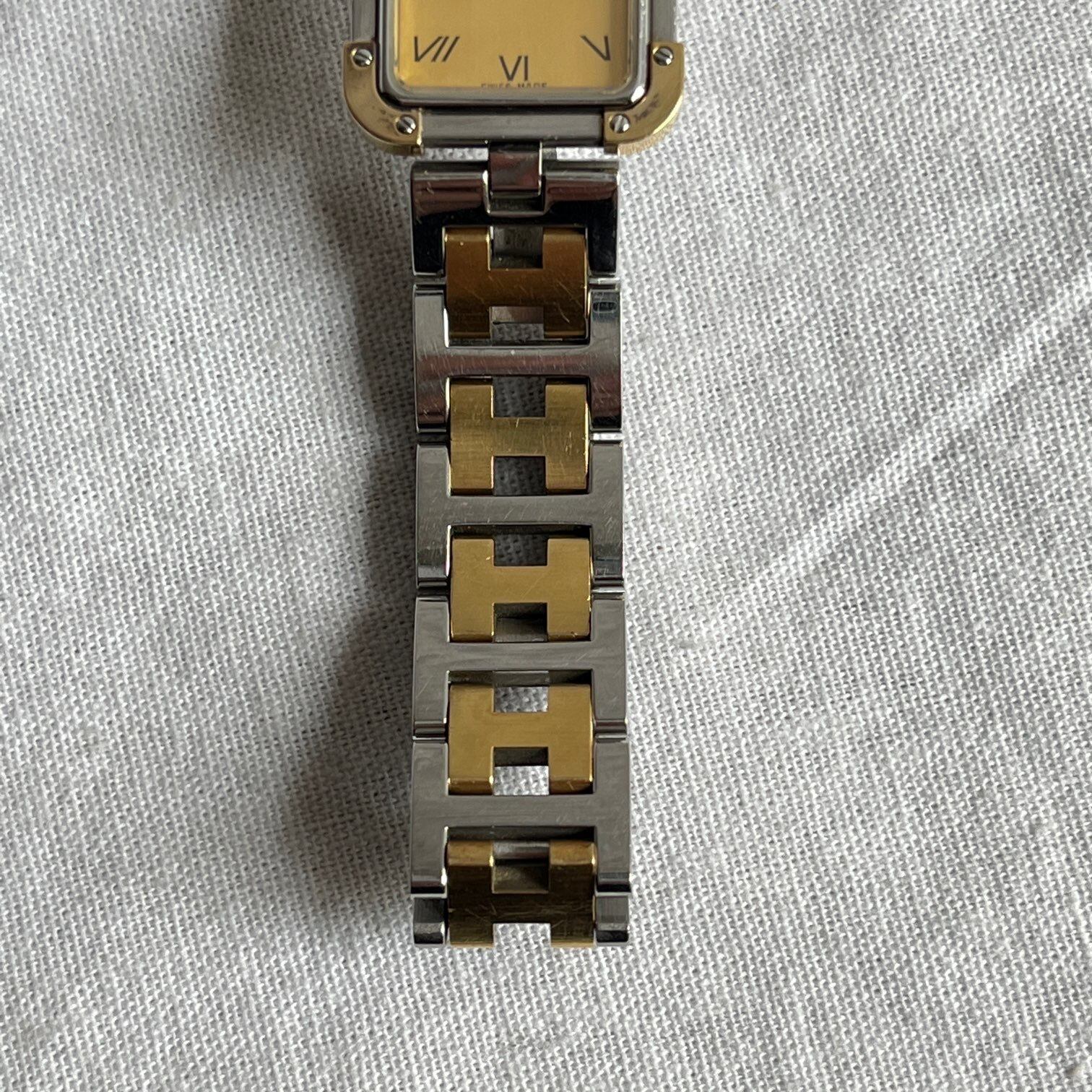 スクエア型の縁にゴールドカラーのビス装飾がクラシカル!シルバー×ゴールドで構成されベルトのHロゴもHERMESならではの存在感あるデザインです。