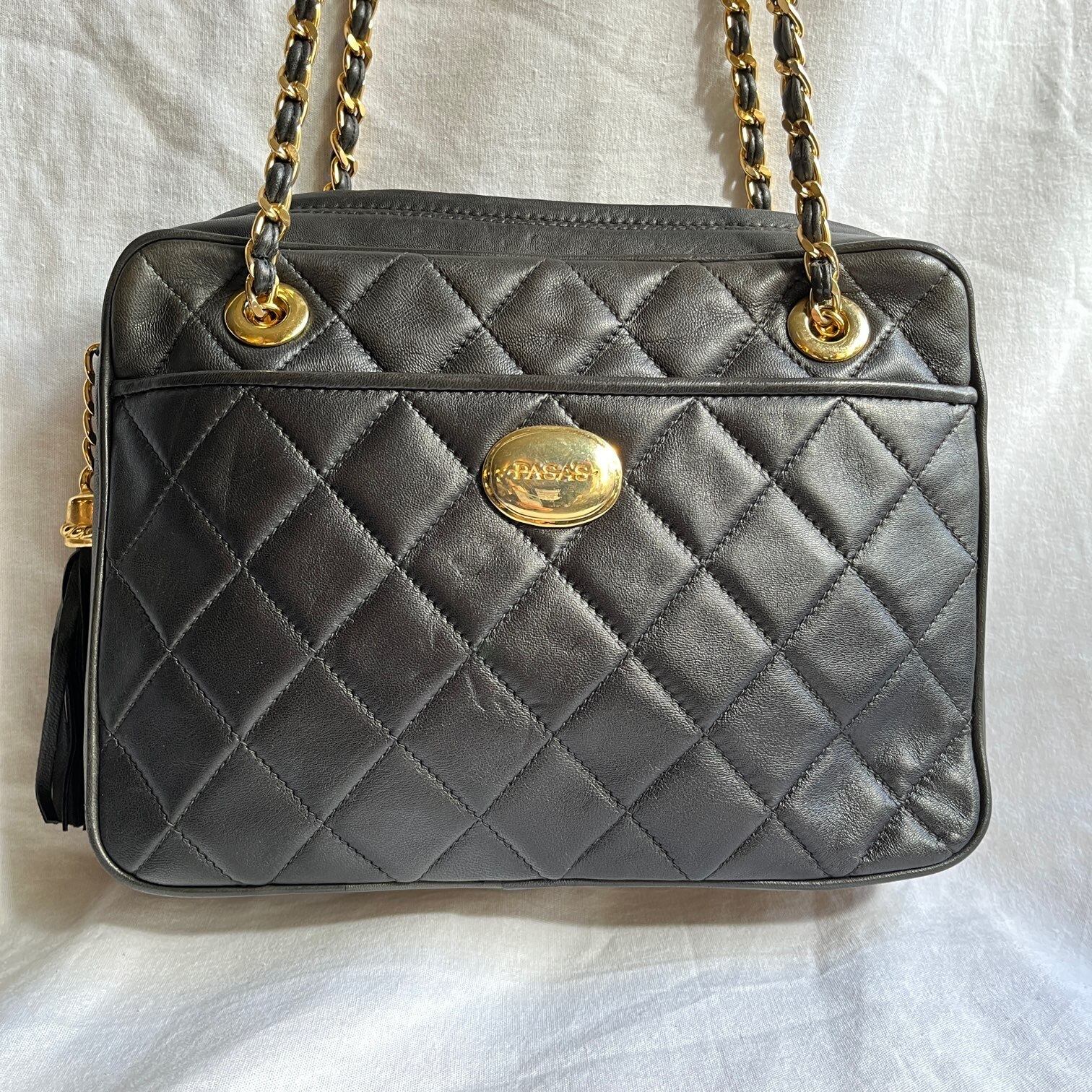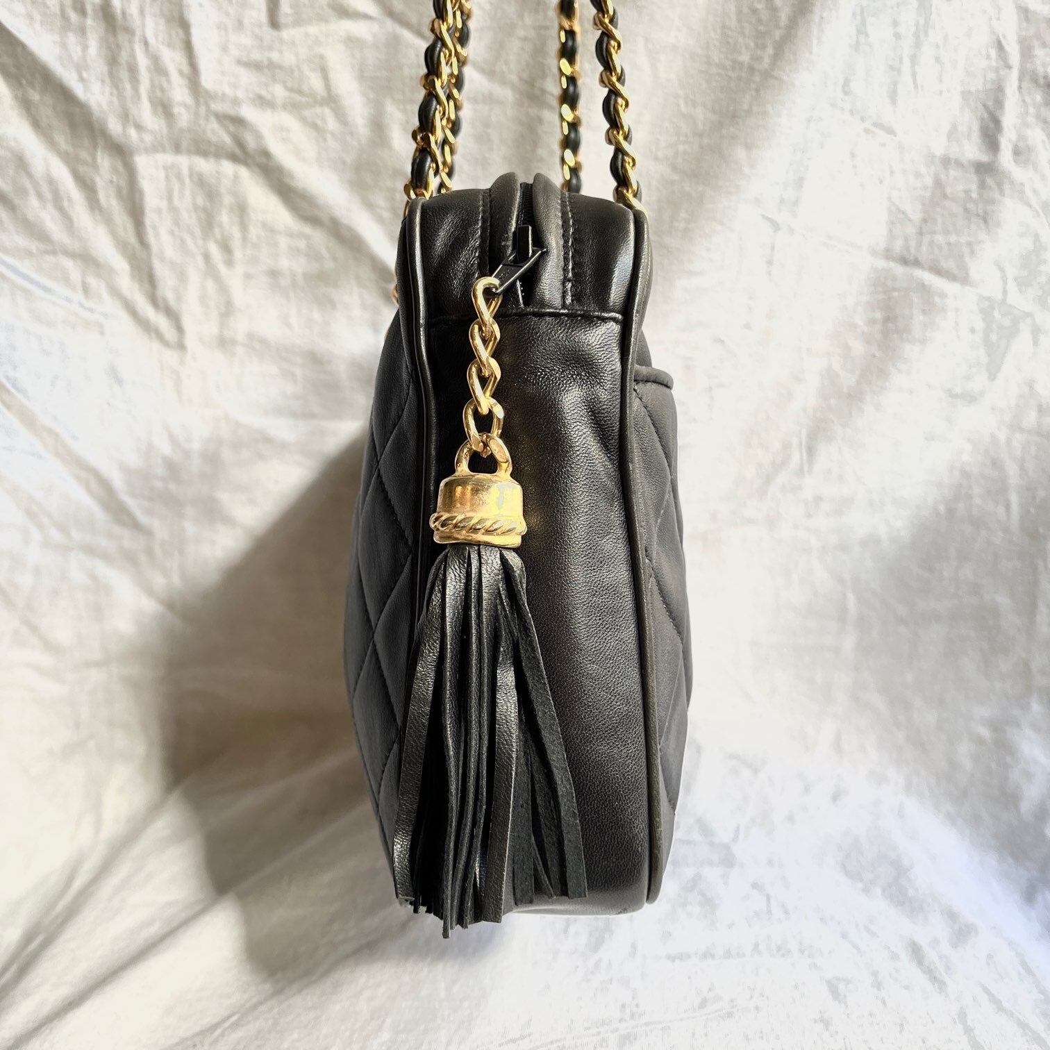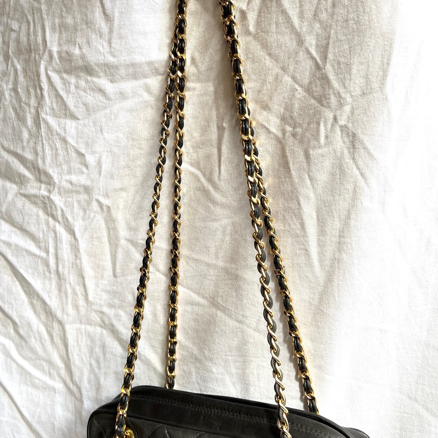 キルティングのブラックレザーチェーンショルダーバッグ。