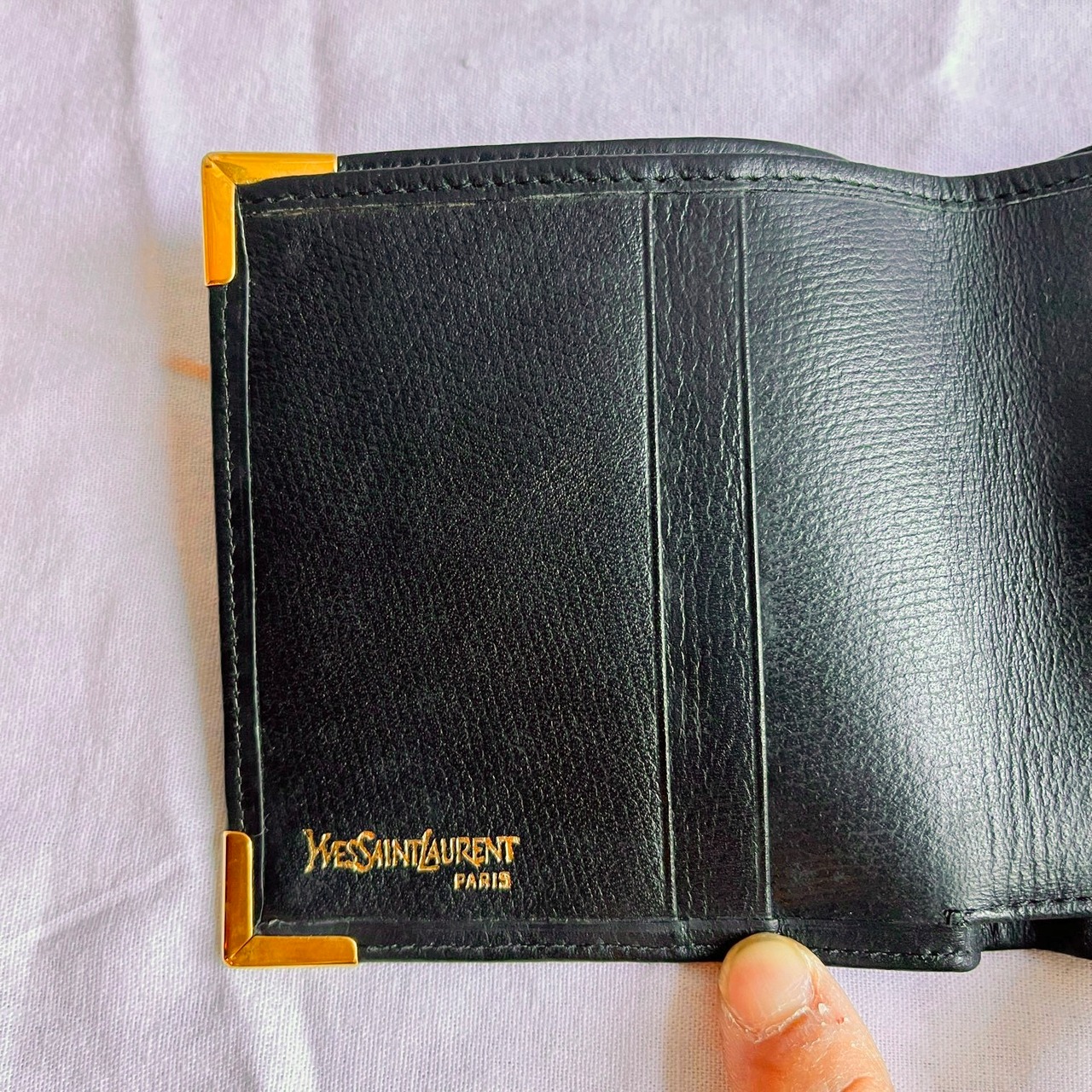 ブラックレザーにゴールドメタルがスタイリッシュなYSL折りたたみ財布、80’s vintage.