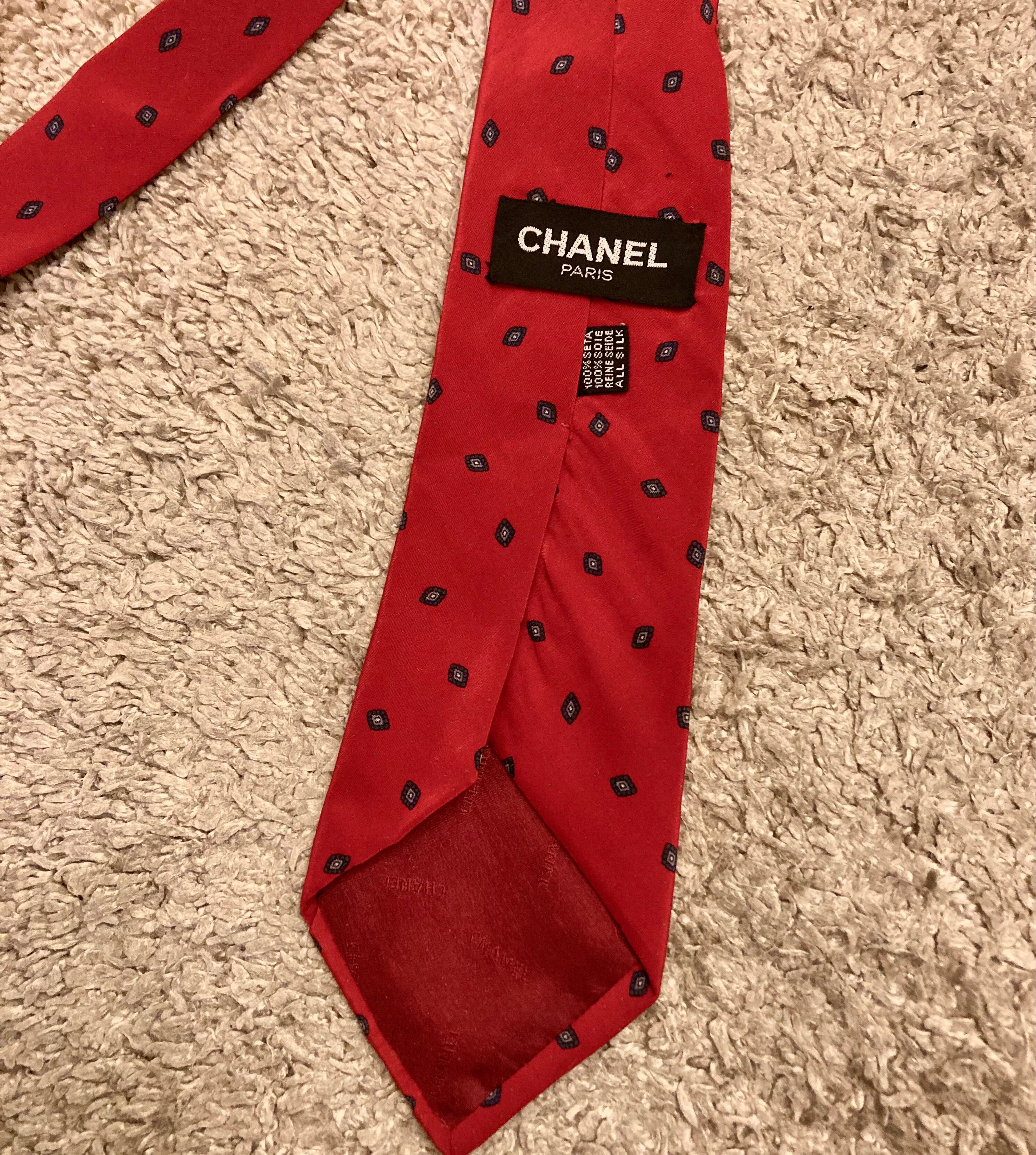 落ち着きのある赤に細かなドットやひし形がクラシカルでポップなCHANELシルクネクタイ☆