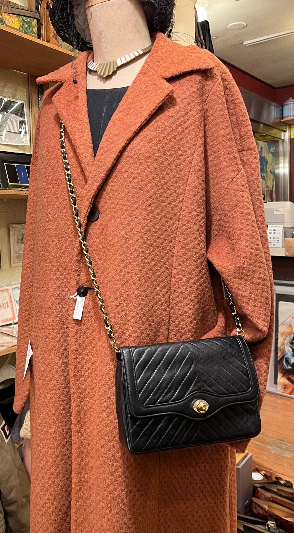 ヘリンボーンの様なキルティングデザインがスタイリッシュなEleganceチェーンショルダーバッグ!程よい小さめサイズ感とゴールドチェーンがエレガントな装い。。中央のゴールド金具もさりげないポイント⭐︎チェーンが外せるタイプでクラッチバッグとしても使えます。