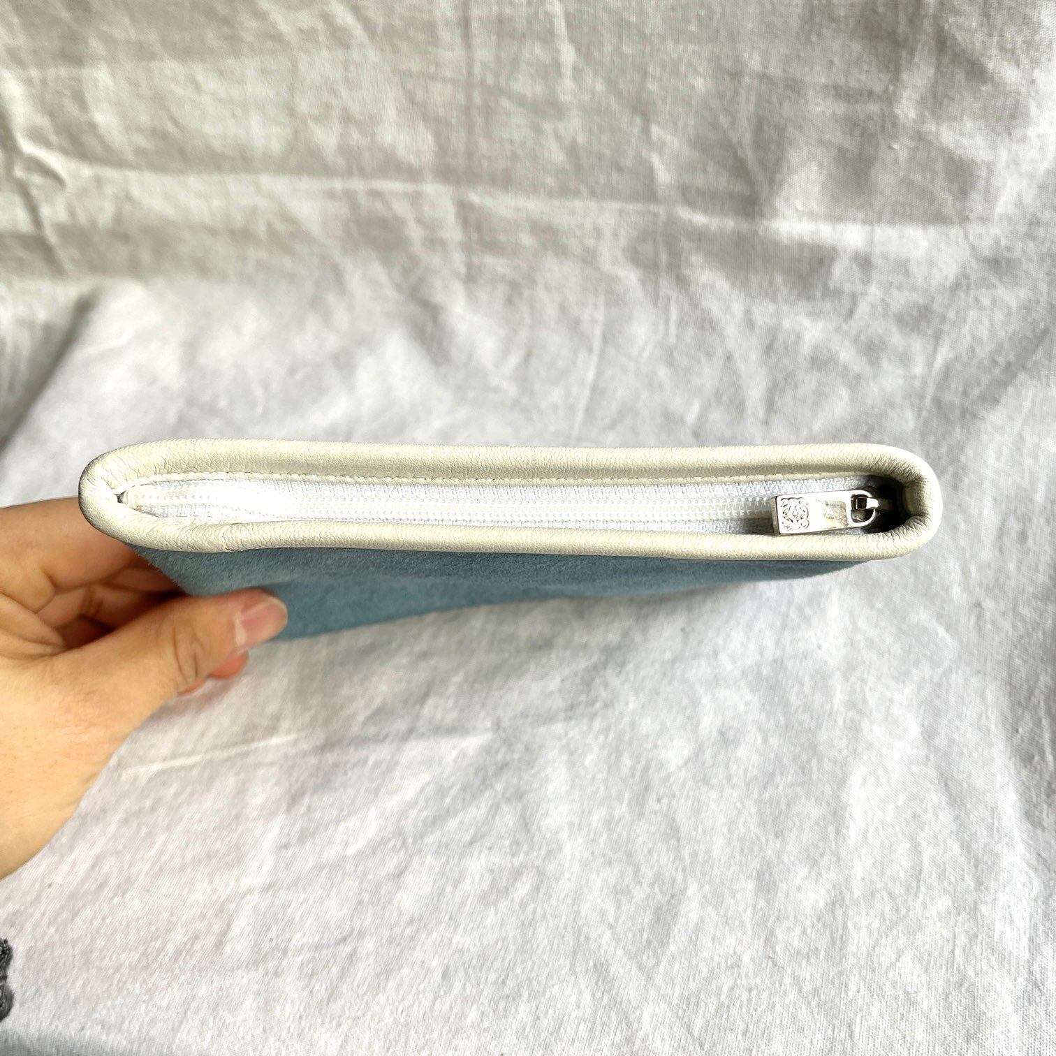 ライトブルーのスエードとホワイトレザーの組み合わせが爽やかなLOEWEポーチ。上質なスエードにアナグラムの型押しがLOEWEらしい高級感。程よいサイズ感でバッグにも入れやすく、様々な用途で使えるアイテムです。箱付きでプレゼントにも☆