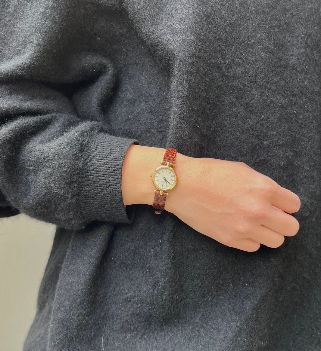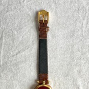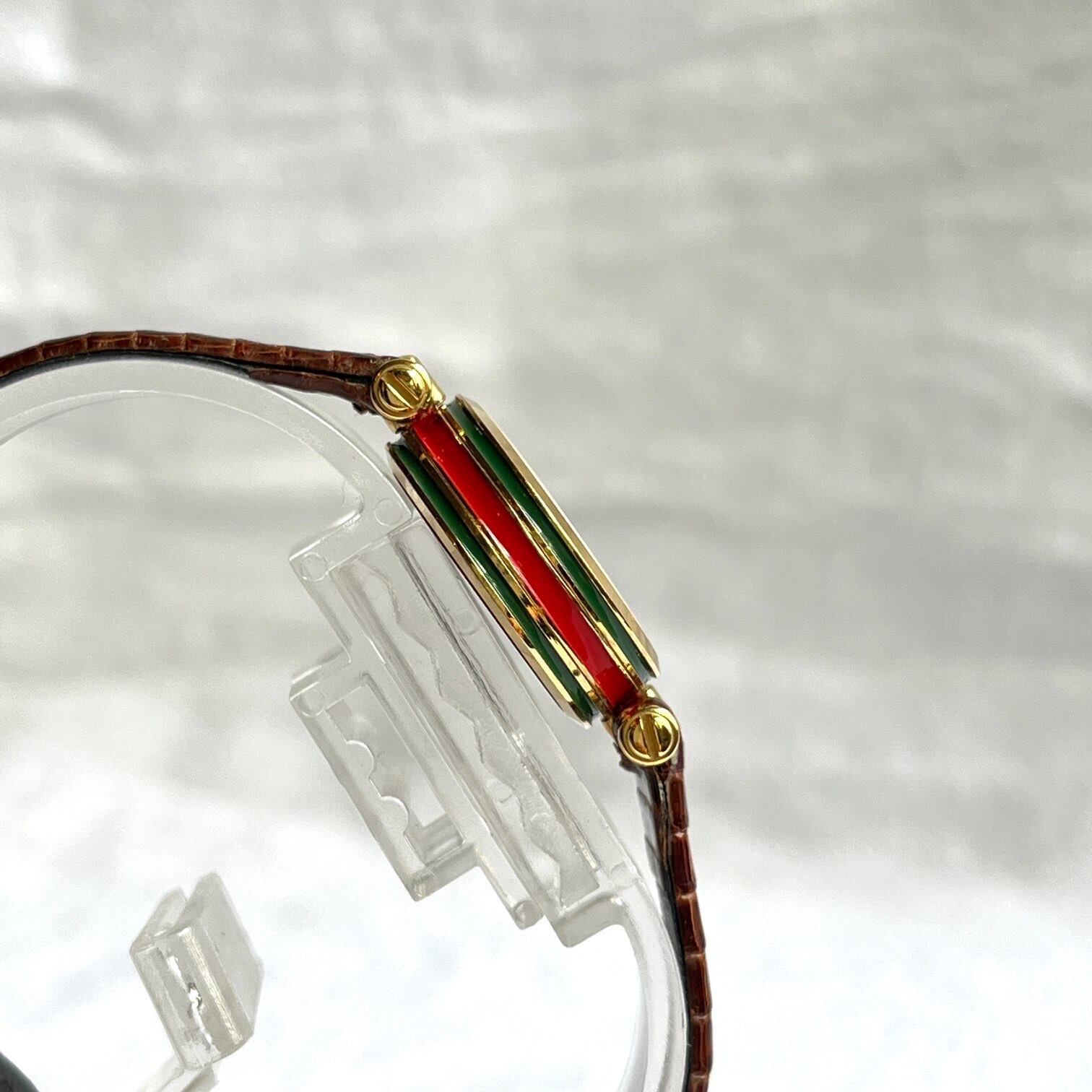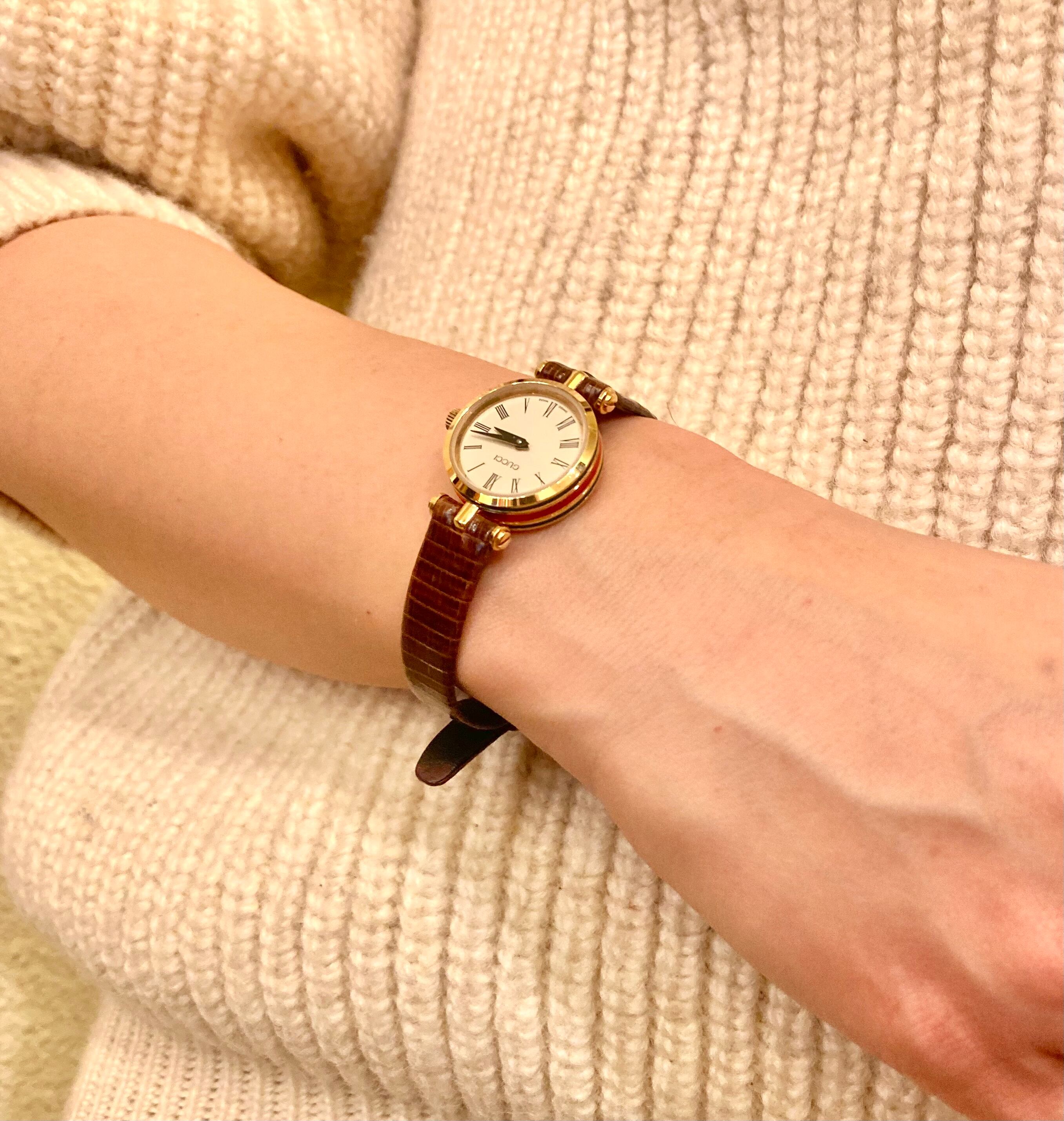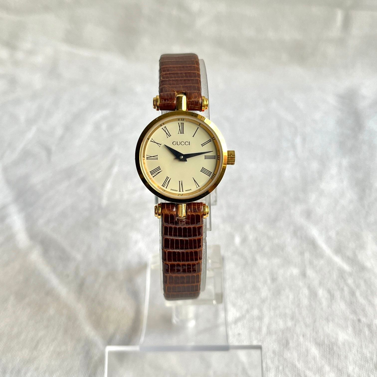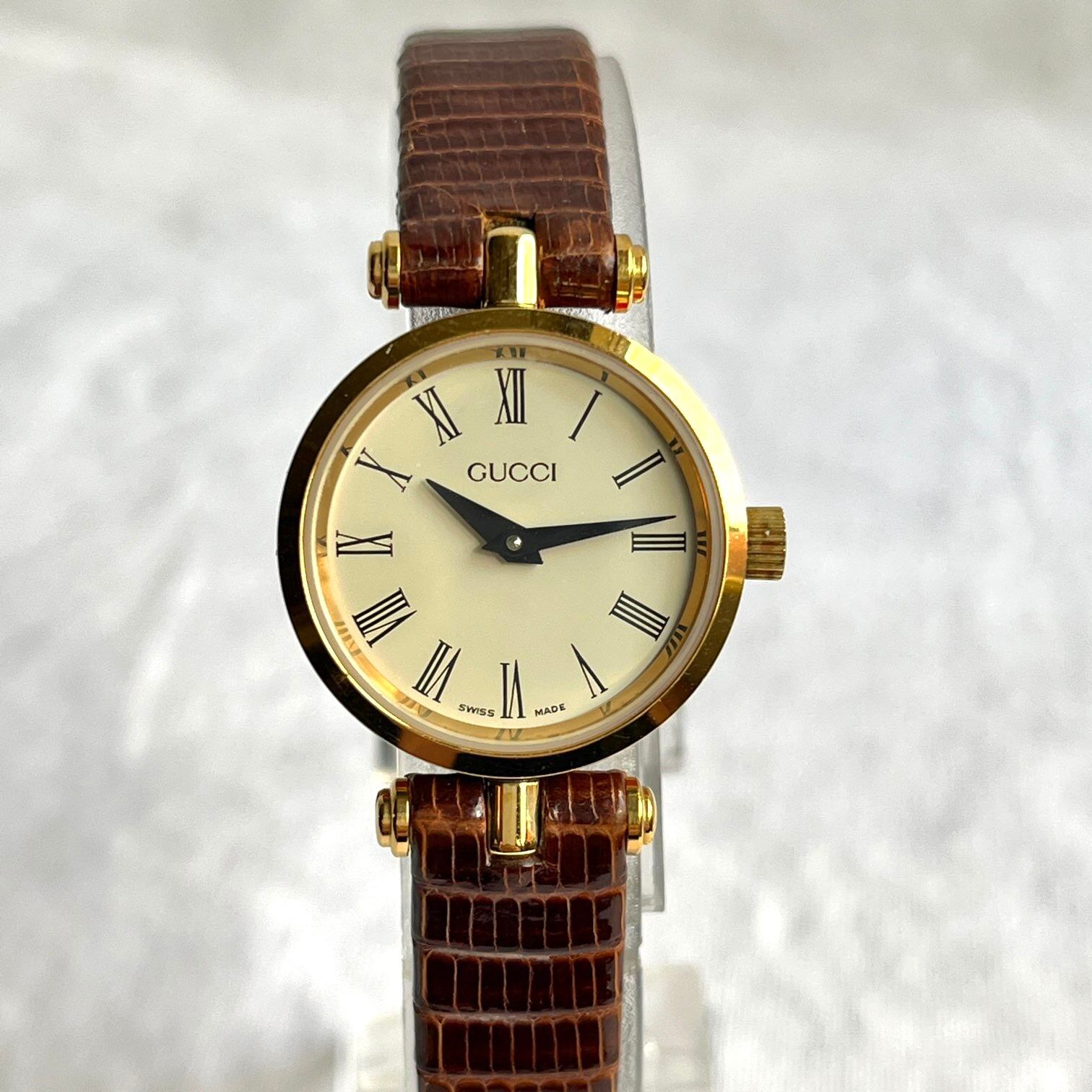 厚みのあるフェイスのサイドに施されたシェリーラインが GUCCIならでは!横からチラッと見えるラインにキュンとします。オフホワイトの文字盤にブラウンの型押しレザーベルトがクラシックな一品です☆