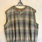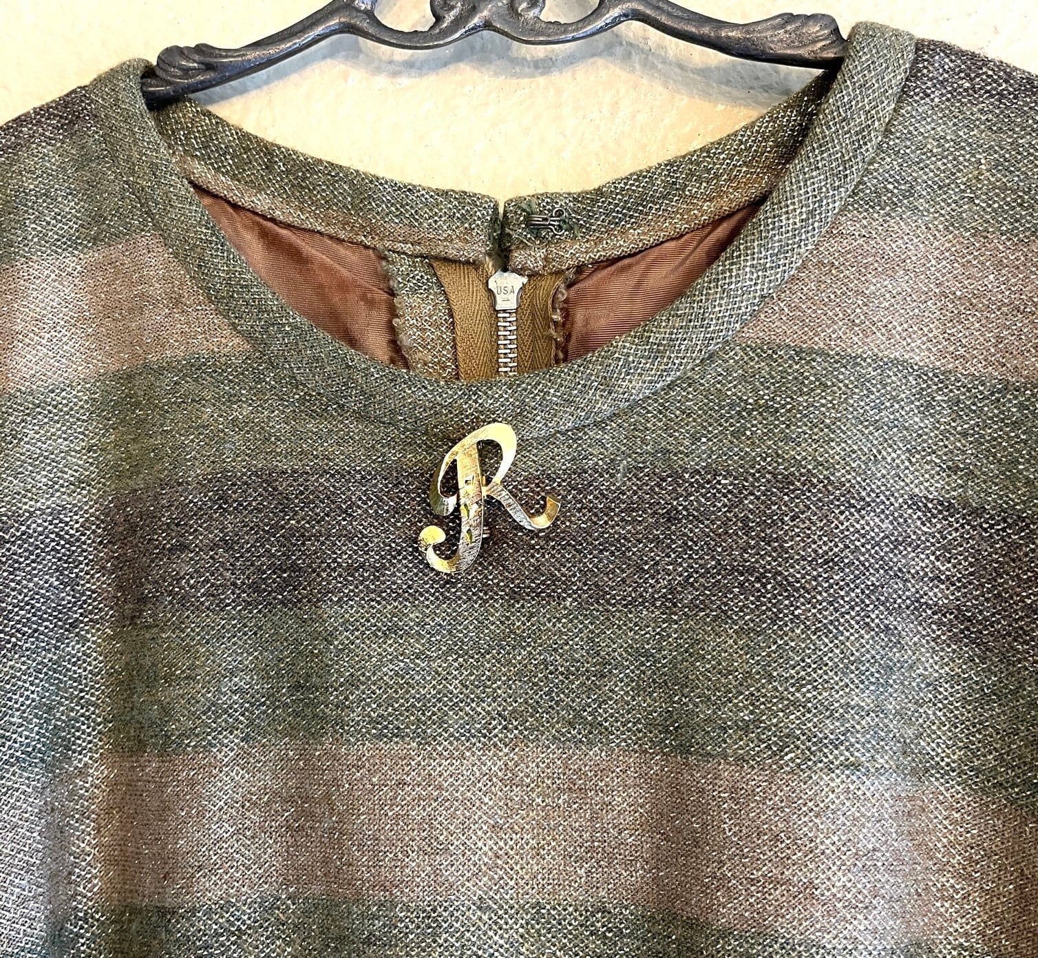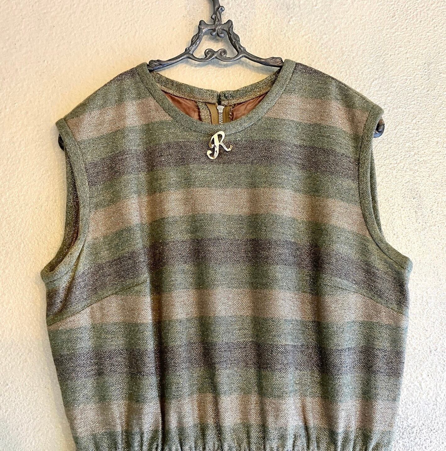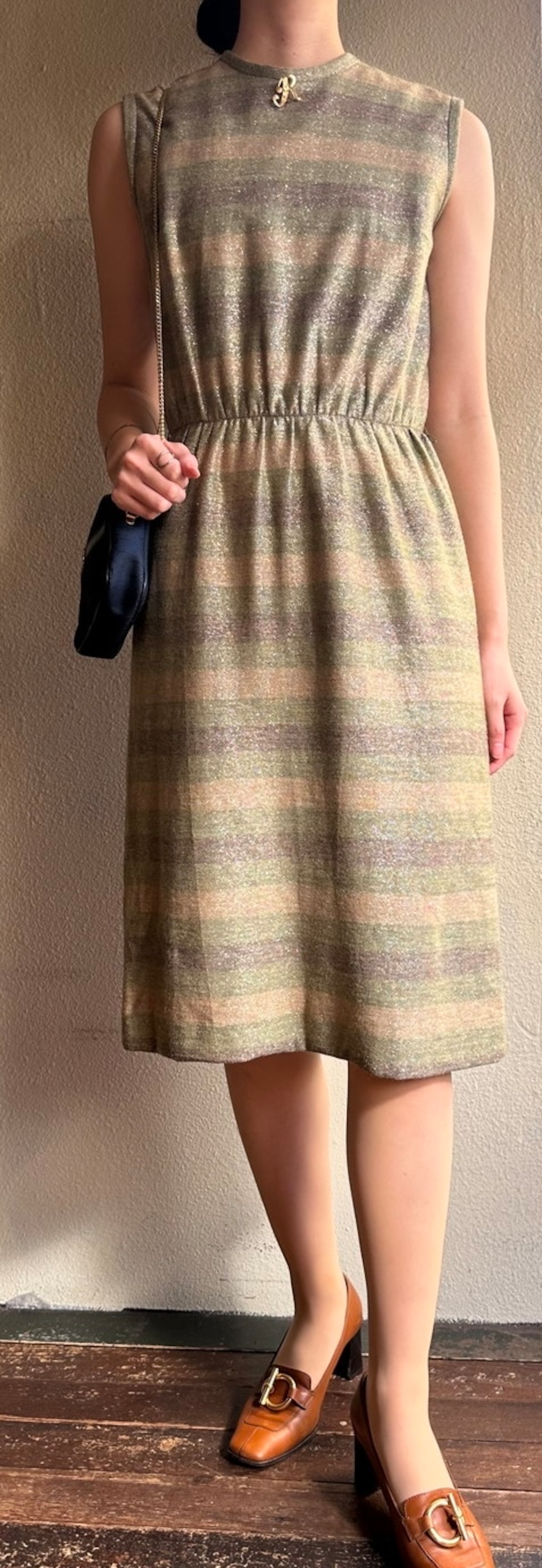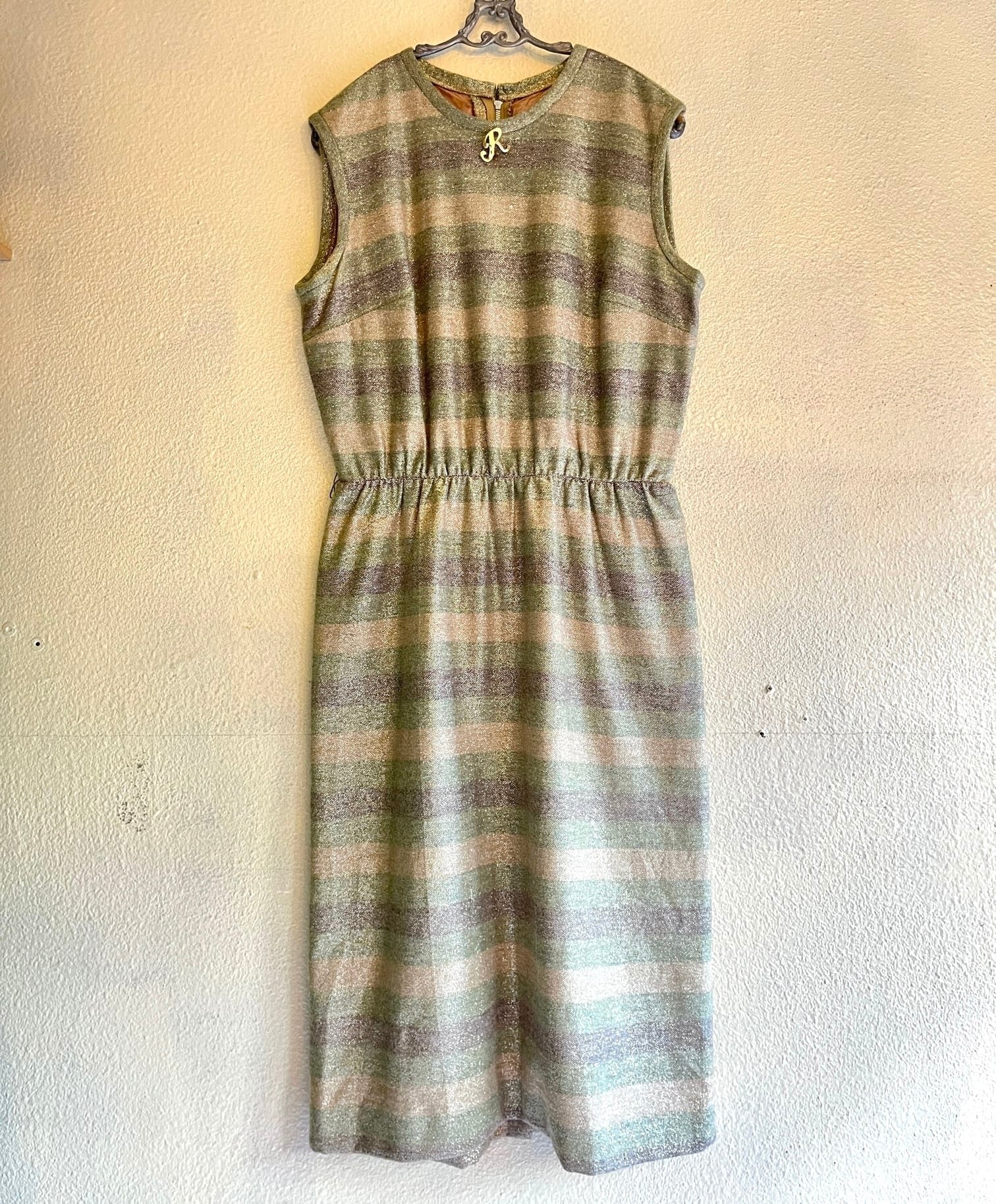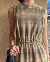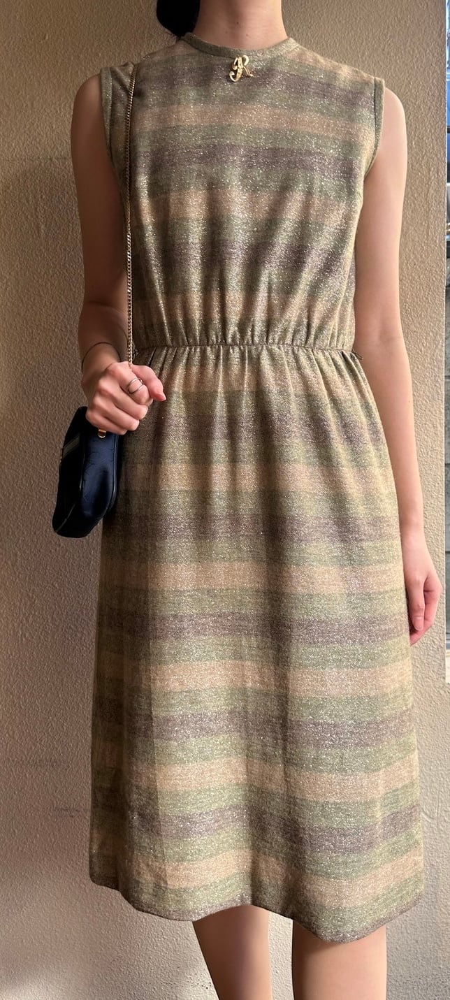 ゴールドラメが輝くエレガントなU.S. 1960~70’s ドレス。同系色のやわらかい色のボーダーが上品且つカジュアルにも着やすいデザイン。首元のRロゴのブローチも際立つポイント☆