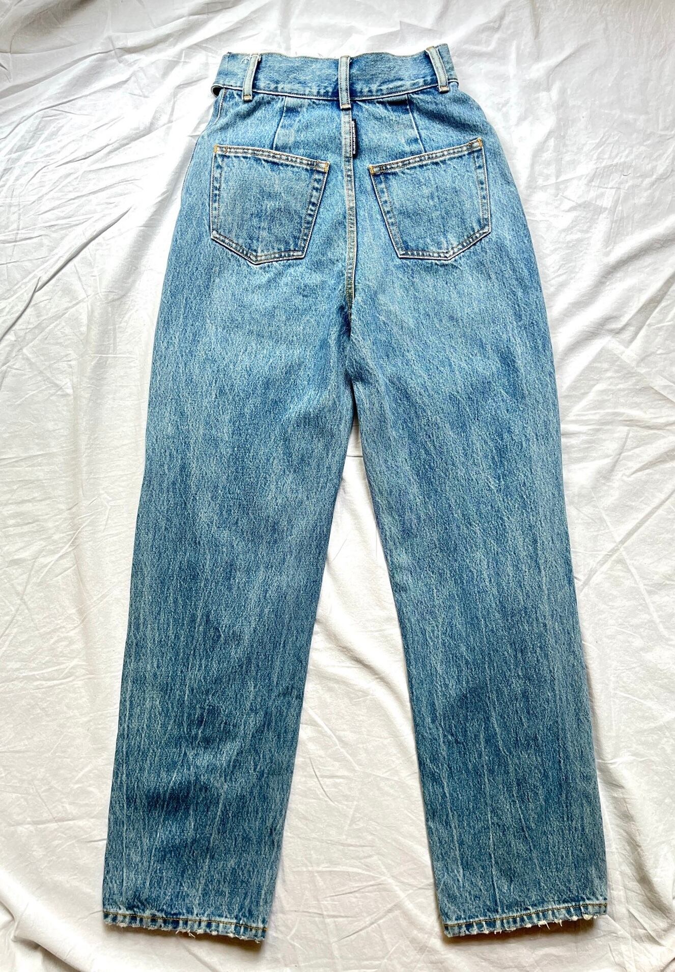 切りっぱなしのウエストに太めのデニムベルトがポイントのアレクサンダーワンのデニムパンツ。ハイウエストのシルエット、バックのタックやタグなどシンプルながらもモードなライン、張りのあるデニムで少しケミカルウォッシュな色合いもエッジが効いたデザイン。シンプルながらも細やかな部分にこだわりが詰まった逸品です。