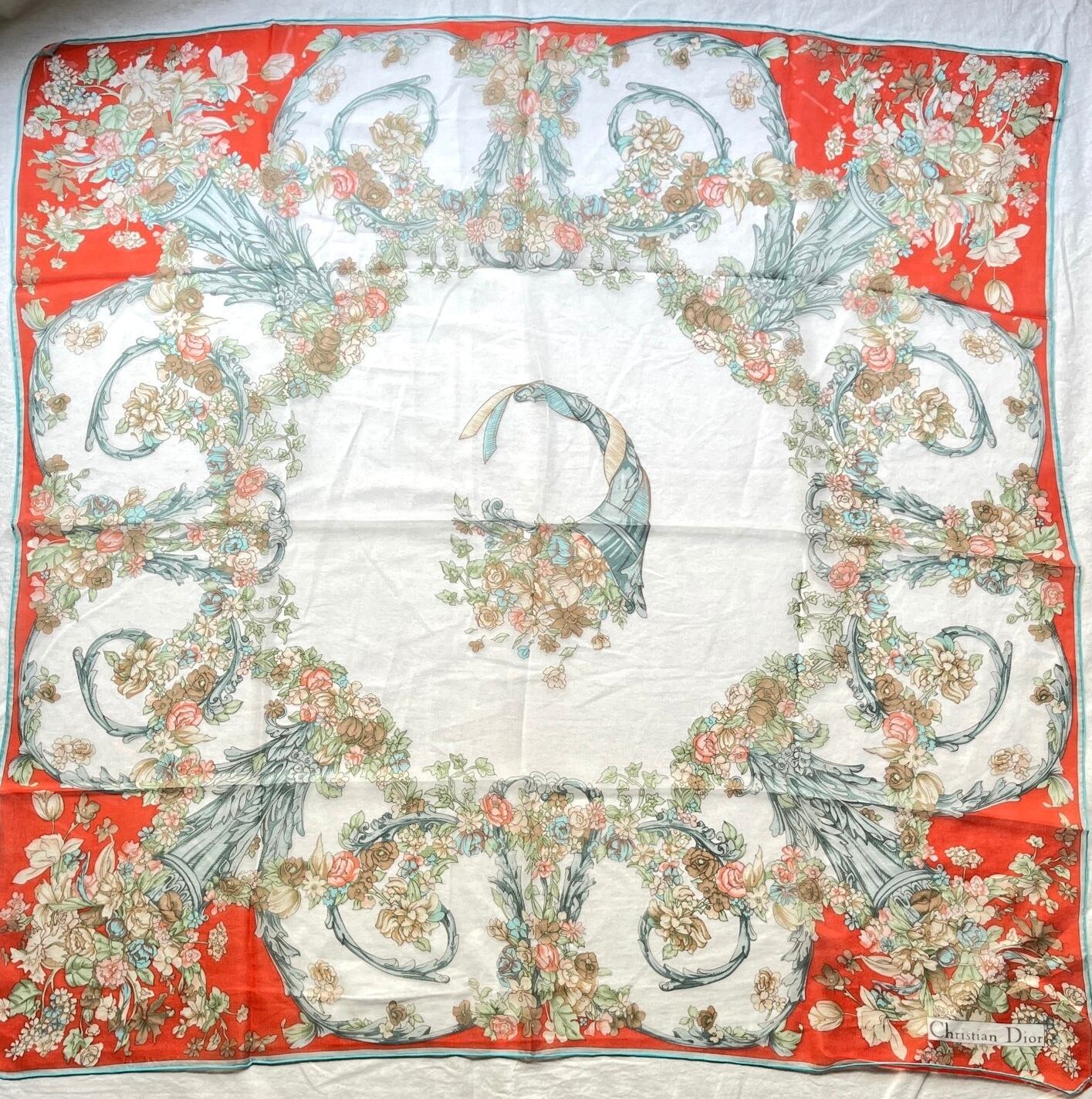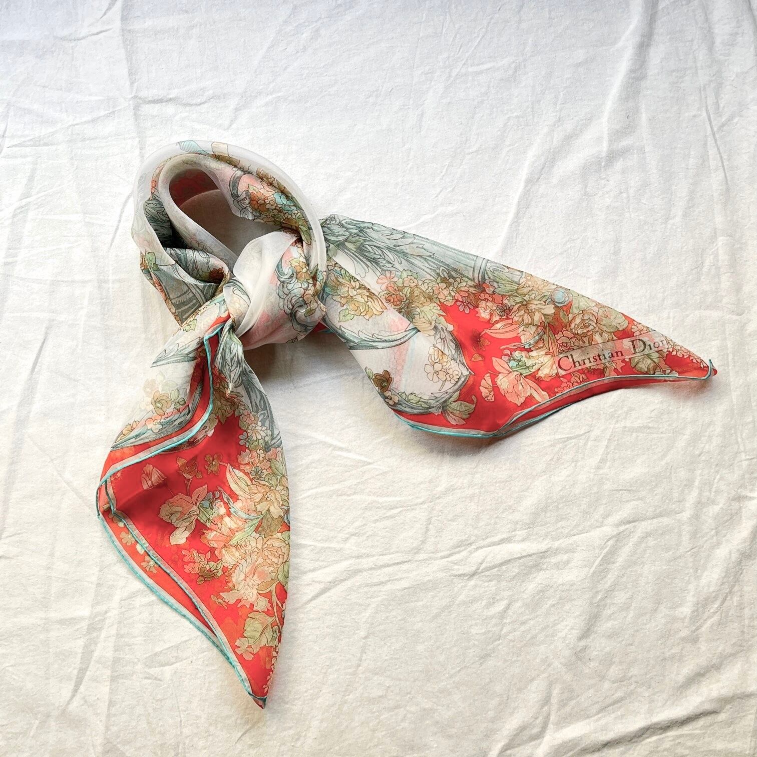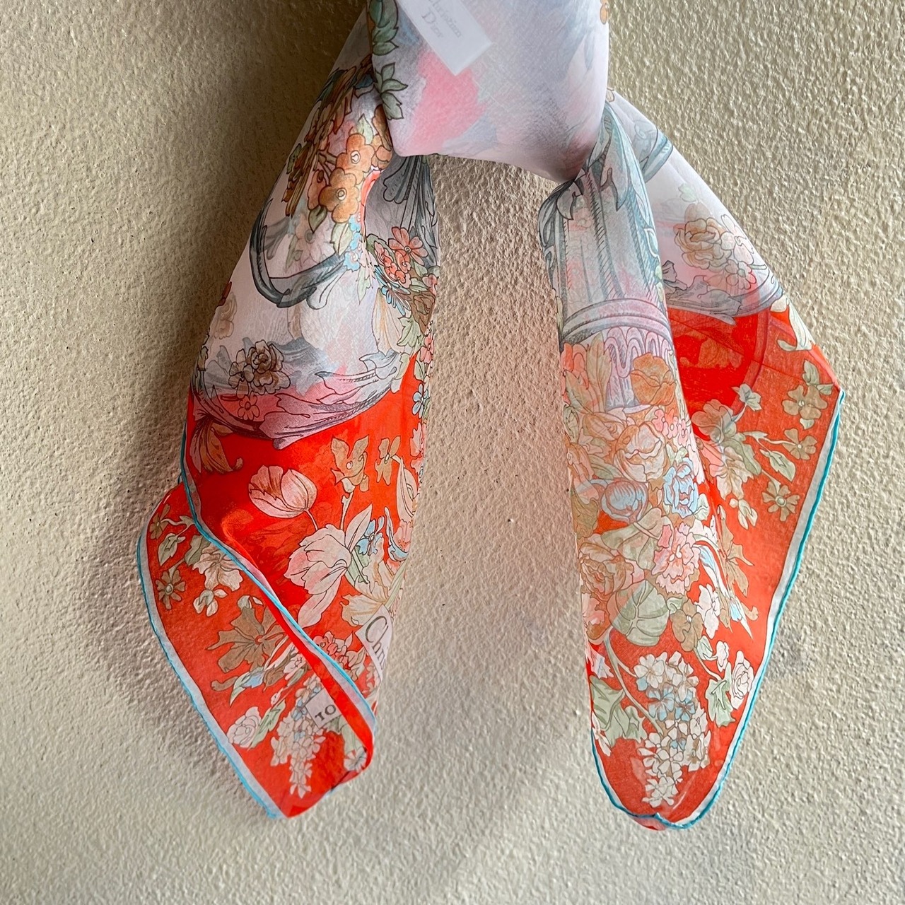 シアー素材にお花のモチーフが華やかで上品なDiorスカーフ。柔らかな雰囲気の中に鮮やかな赤と水色のパイピングがメリハリのあるデザイン。シアー素材が軽やかで春らしいコーディネートに☆