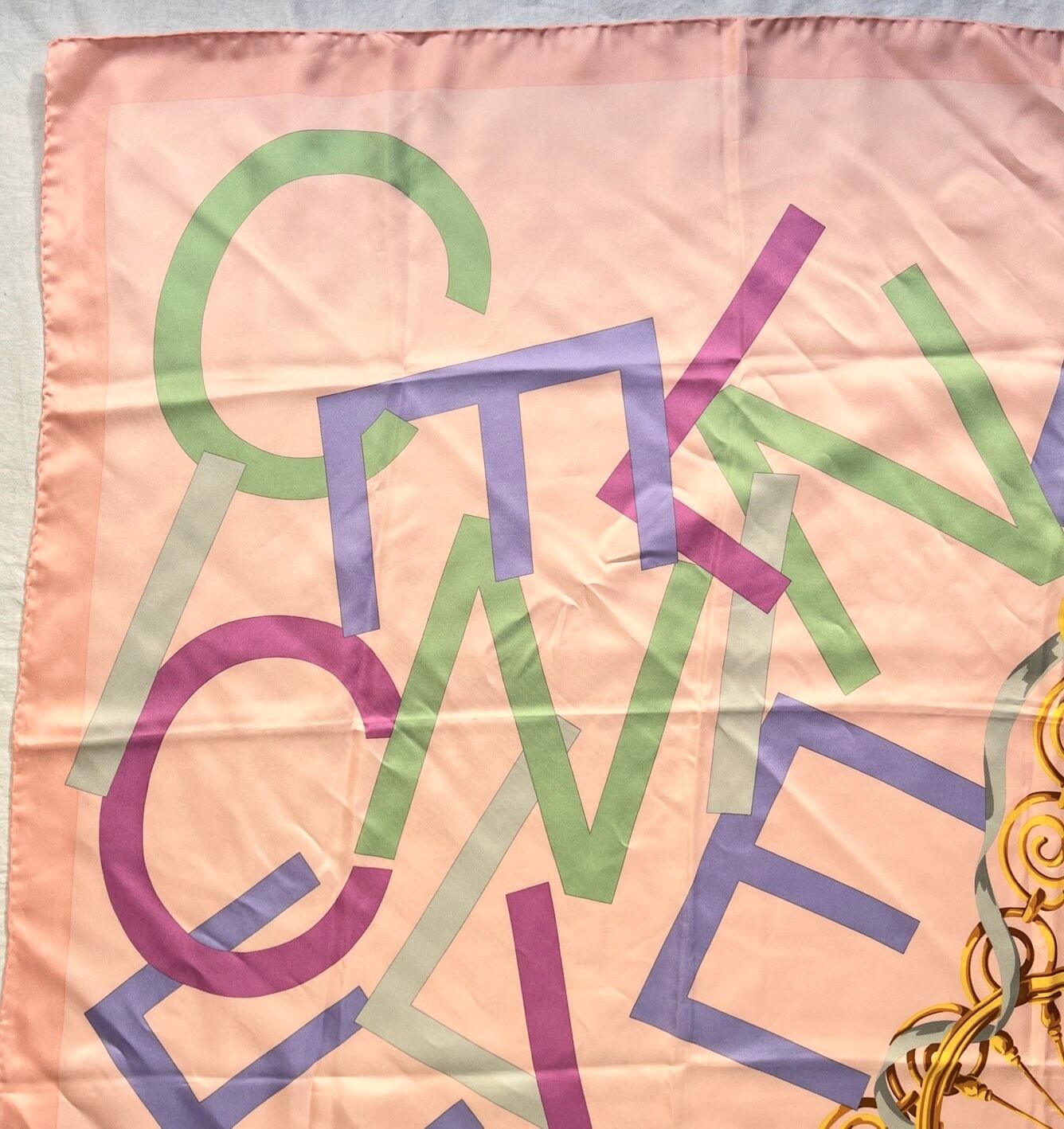 華やかなピンクにパステルカラーのCELINEロゴがキュートなSilkスカーフ。ゴールドがポイントとなったセリーヌらしい上品なデザイン。一気に春気分にさせてくれる1点☆