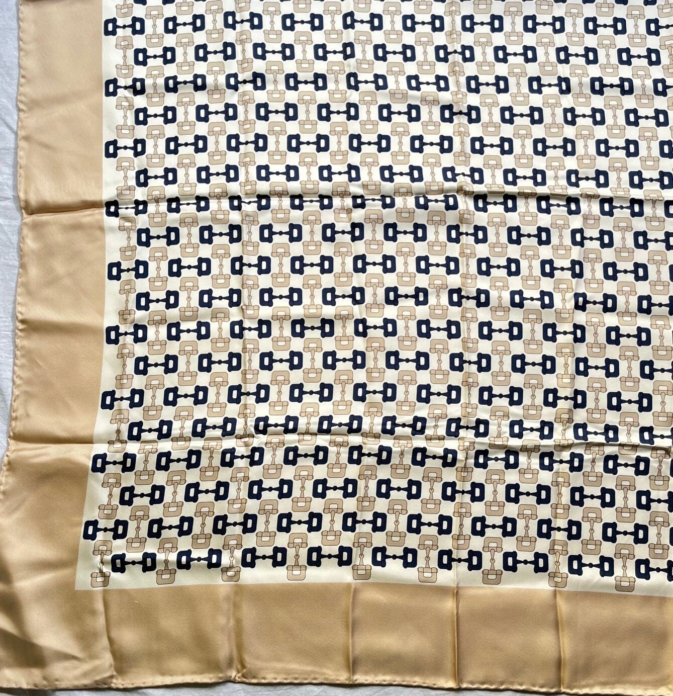 ベージュ、アイボリーベースで柔らかく上品な印象。ビットが幾何学的に配置されたデザインが珍しく、クラシカル。さりげなくGucciを象徴するパターンが魅力的な1枚。