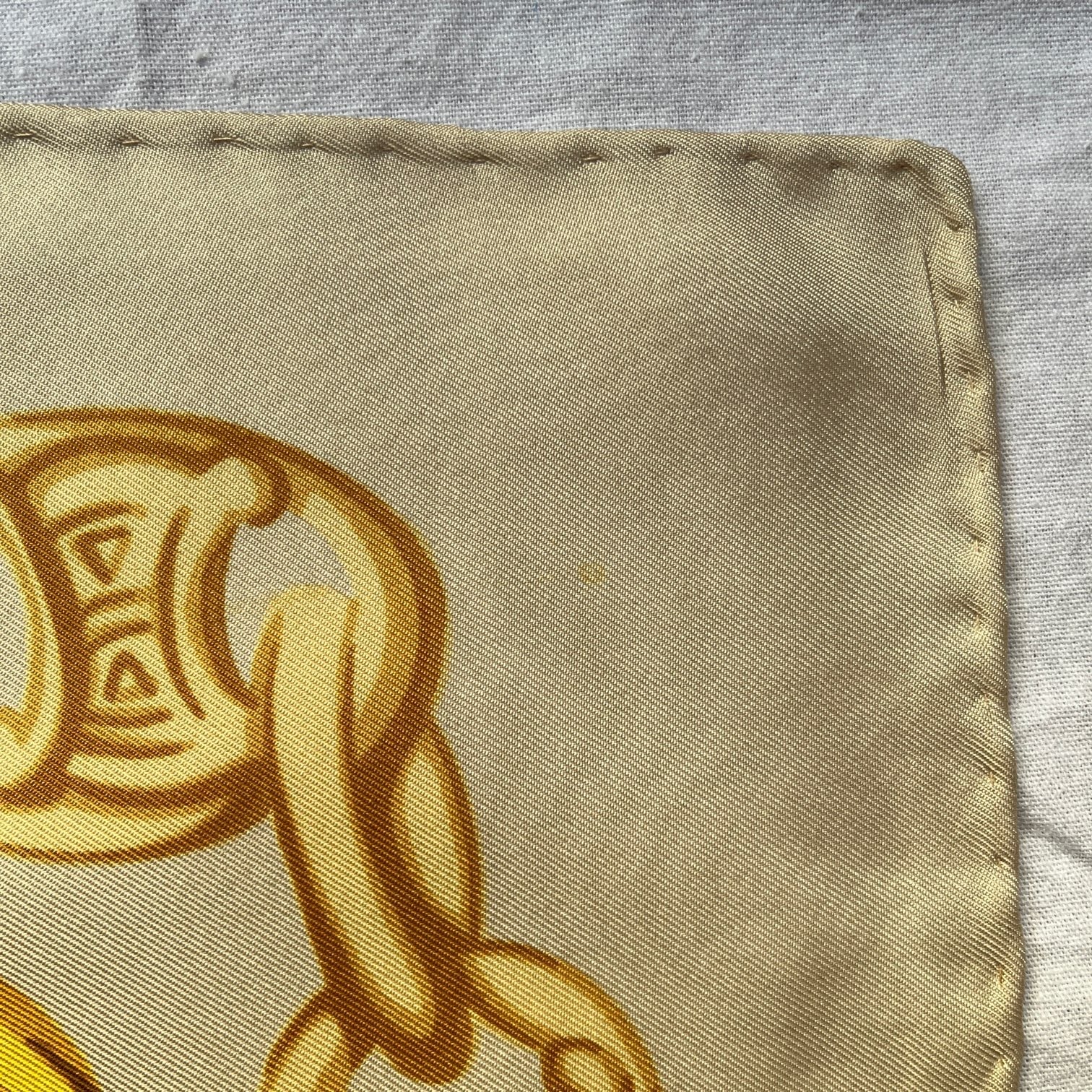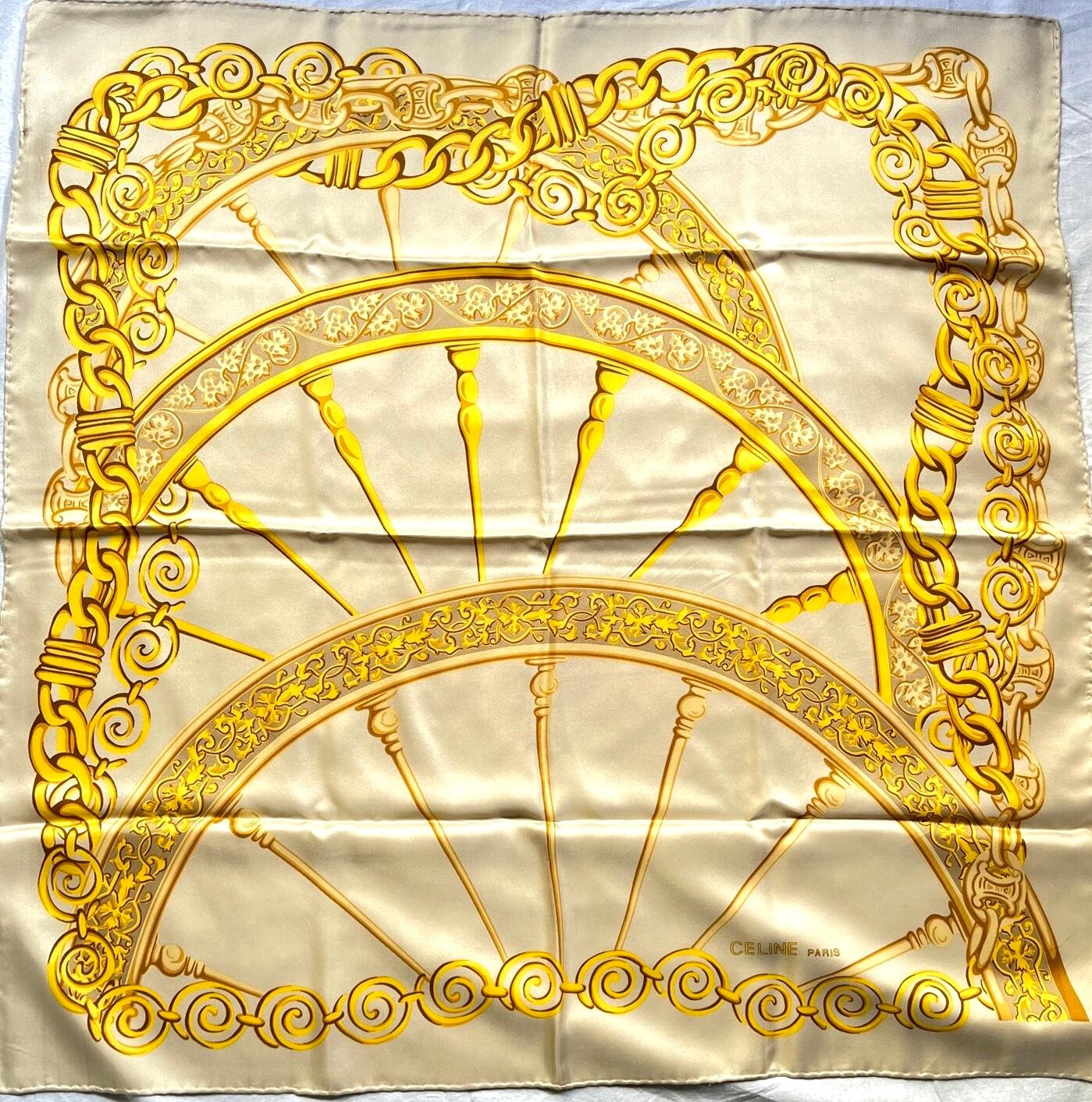 ベージュにゴールドチェーンや馬車モチーフがクラシカルなCELINEスカーフ。細やかなデザインや曲線が美しく上品。さりげないマカダムチェーンもセリーヌらしさのあるポイントに☆