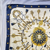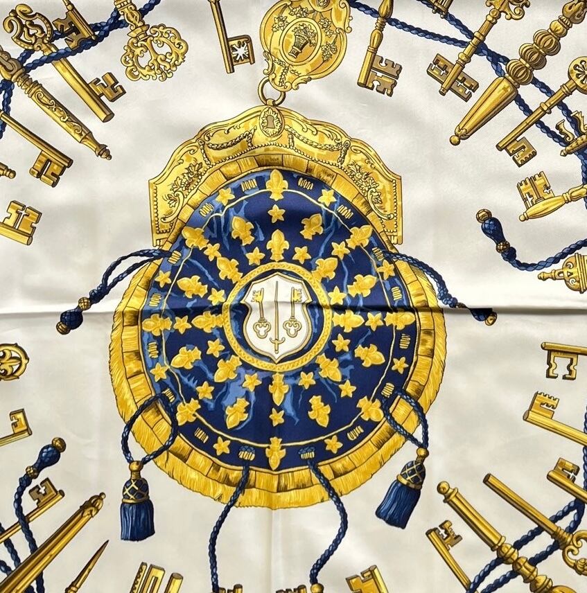 アールヌーボーの細やかで美しいカギが存在感あるHERMESスカーフ。ホワイト×ネイビーのベーシックなカラーリングがコーディネートに合わせやすく洗練されたデザインです☆