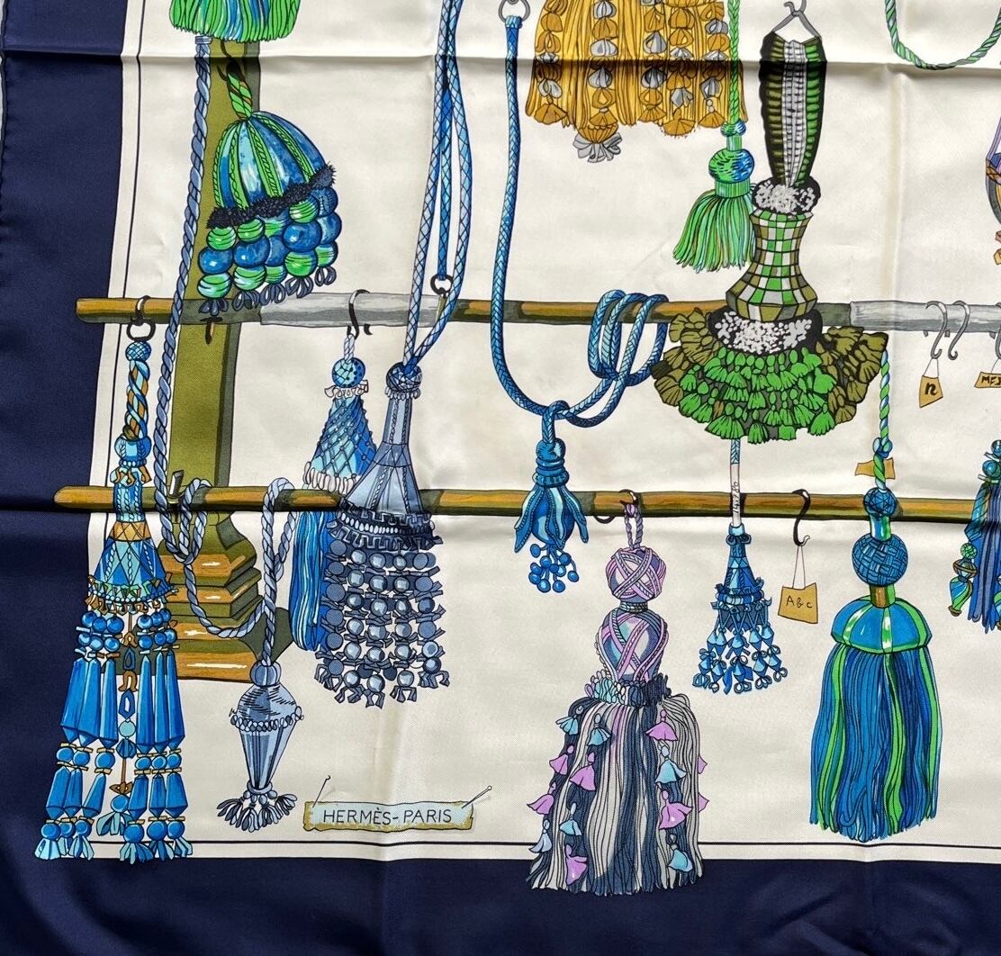 様々なタッセルが木にぶら下がり、お店のディスプレイのような絵画のHERMESスカーフ。ホワイト×ブルー×グリーンのカラーリングが透明感があり洗練された印象に。