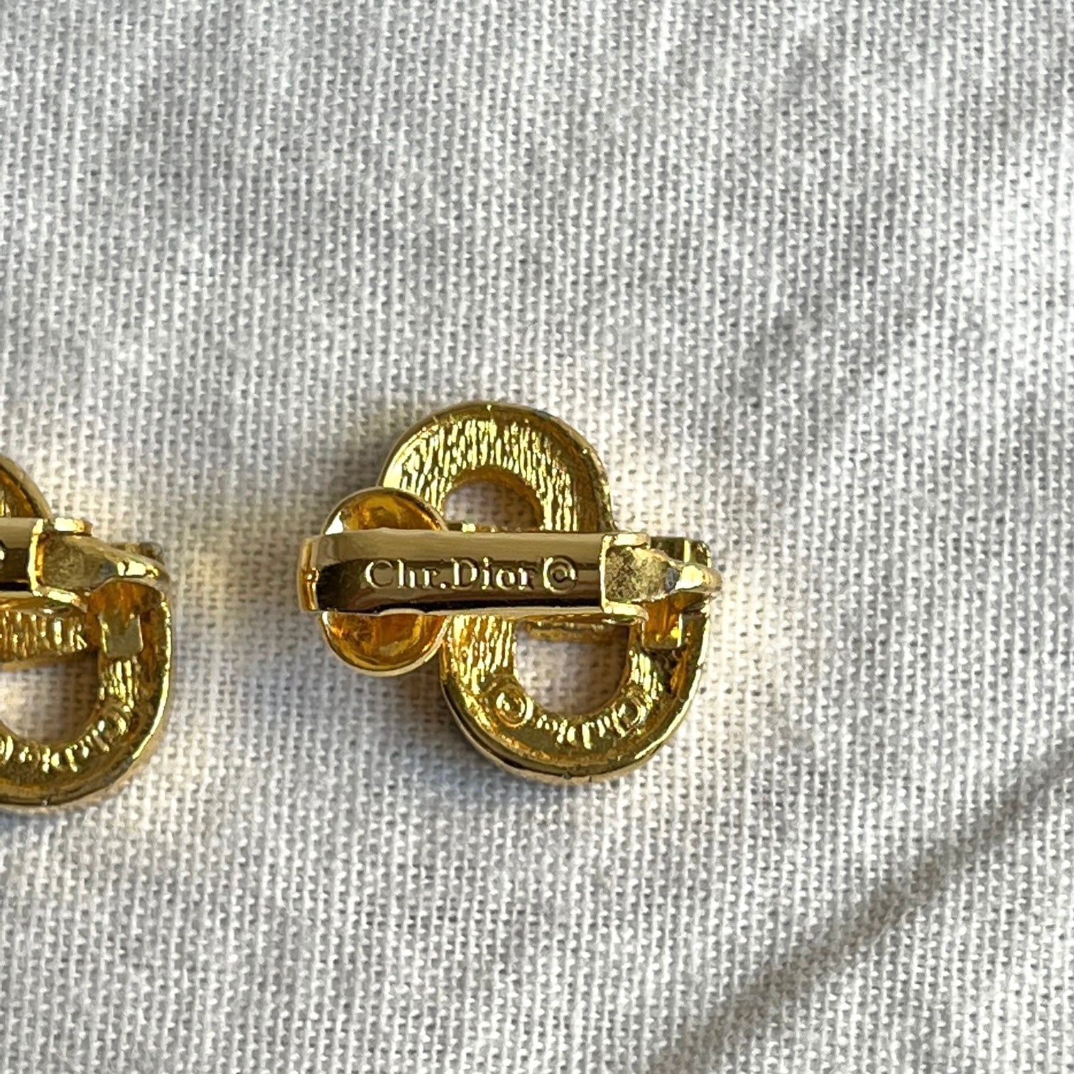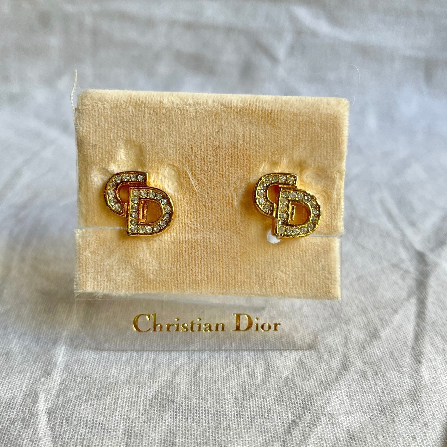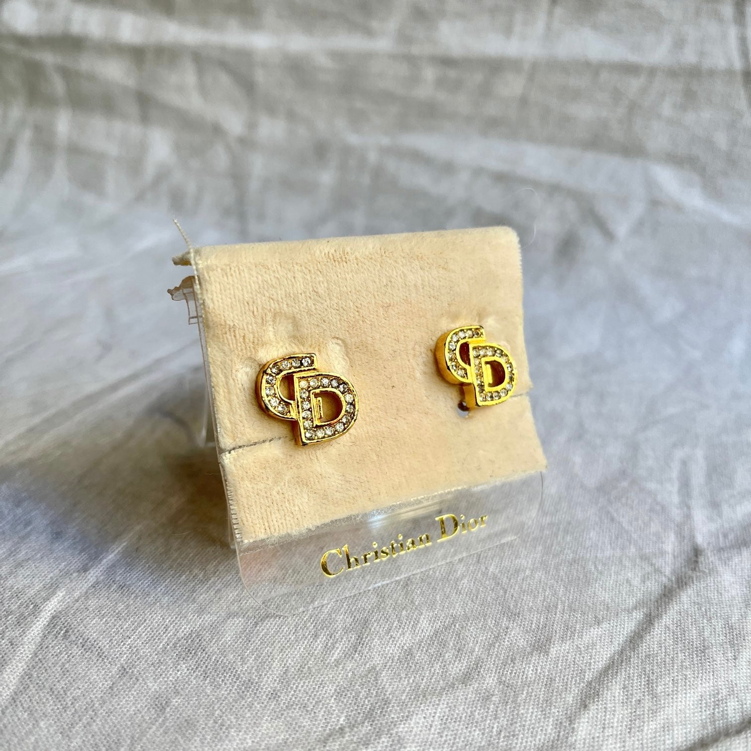 キラキラと輝くラインストーンとゴールドが上品なDiorイヤリング。CDロゴがさりげなくもクールでスタイリッシュ!程良いサイズ感で様々なシーンで活躍してくれる1点です☆